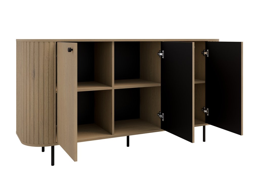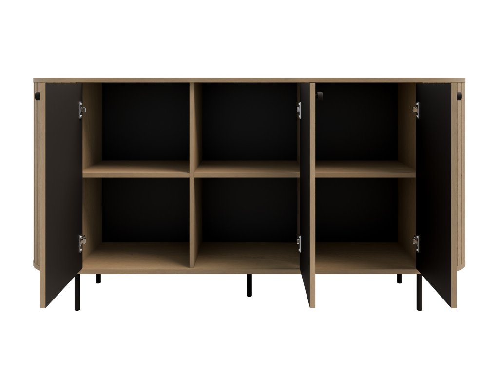Ovalio nappali komód Cremona tölgy dekorban természetes és elegáns hatást kelt, miközben meleg és modern stílust visz a belső térbe. Három ajtó tágas polcos tárolót rejt, ideális apróságok, textíliák vagy dokumentumok rendezésére. A karcsú fekete fém lábak légies megjelenést kölcsönöznek a komódnak, míg a fekete gombfogantyúk kiemelik annak kifinomult és időtlen jellegét. A felső lap elegendő helyet biztosít dekorációk, lámpák vagy kedvenc kiegészítők számára, amelyek otthonossá és teljessé teszik a szoba összképét.