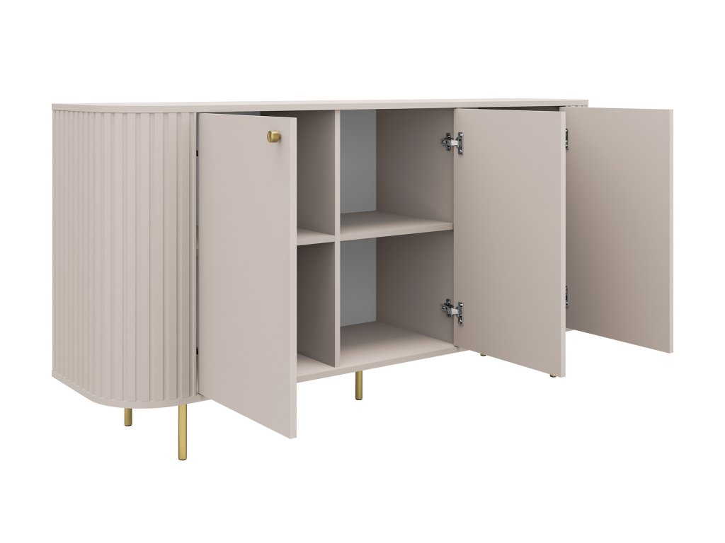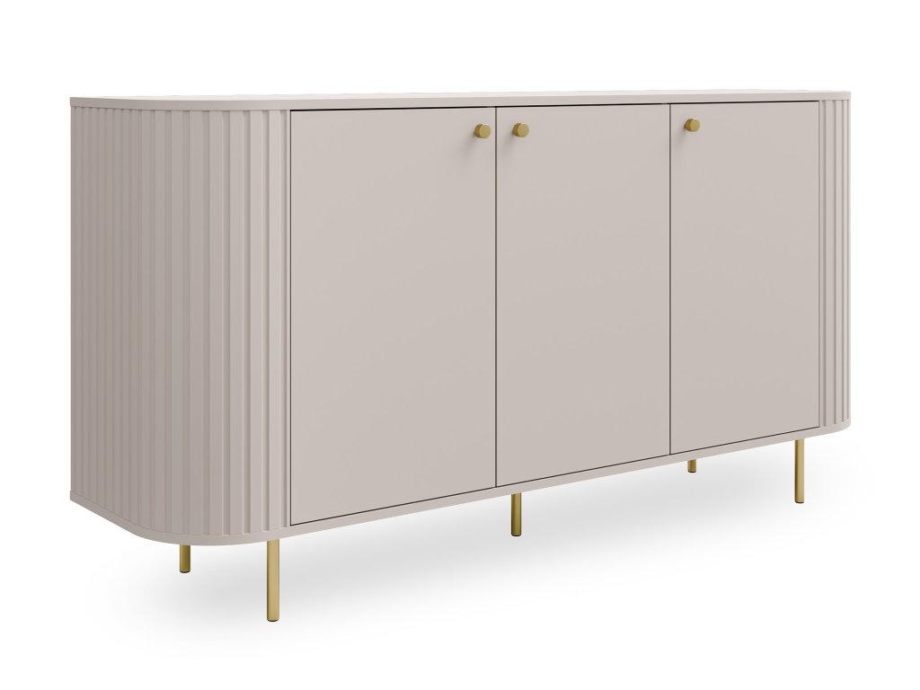 Az Ovalio komód finom homok árnyalatban elegánsan, modernül és egyben nagyon természetesen hat, így könnyen illeszkedik világos és otthonos belső terekbe is. Három ajtó tágas polcos tárolót rejt, amely lehetővé teszi az apróságok, textíliák vagy dokumentumok praktikus elrendezését. Az egyenes fém lábak légies megjelenést kölcsönöznek a bútornak, míg az arany gombos fogantyúk kiemelik annak visszafogott eleganciáját. A komód felső lapja bőséges helyet kínál dekorációk, lámpa vagy kedvenc kiegészítők számára, amelyek még otthonosabbá teszik a szoba összképét.