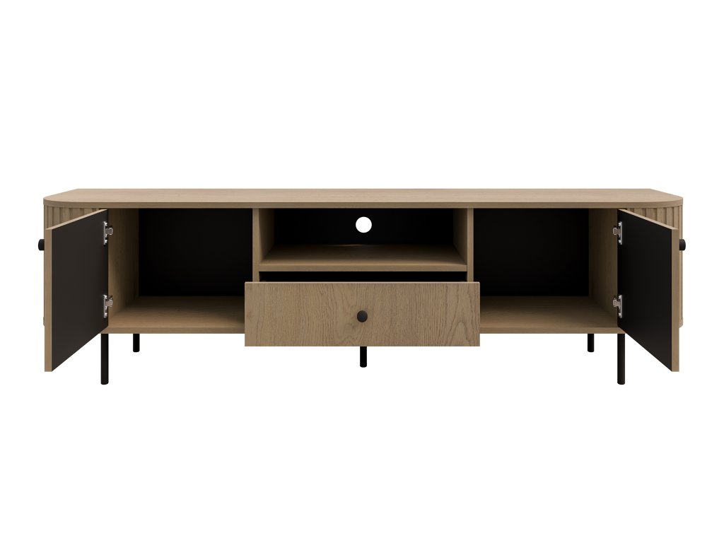 TV szekrény Ovalio cremona tölgy dekorban kellemes, kiegyensúlyozott légkört teremt a belső térben, miközben modern és időtlen hatást kelt. A két ajtó, fiók és nyitott polc kombinációja praktikus megoldást kínál az elektronika, könyvek és dekorációk tárolására. A fekete fém fogantyúk és a karcsú lábak karaktert és vizuális könnyedséget kölcsönöznek a szekrénynek. Tiszta dizájnjának köszönhetően természetesen illeszkedik a modern, minimalista és skandináv nappali terekbe, ahol funkcionális és esztétikai szerepet is betölt.