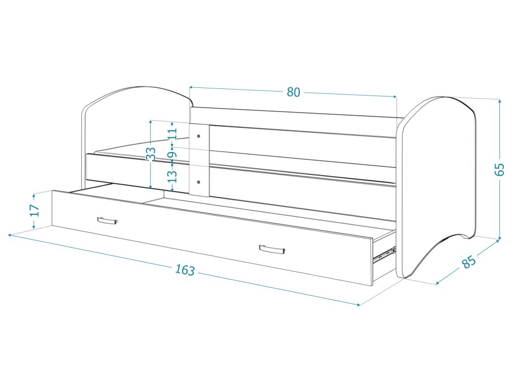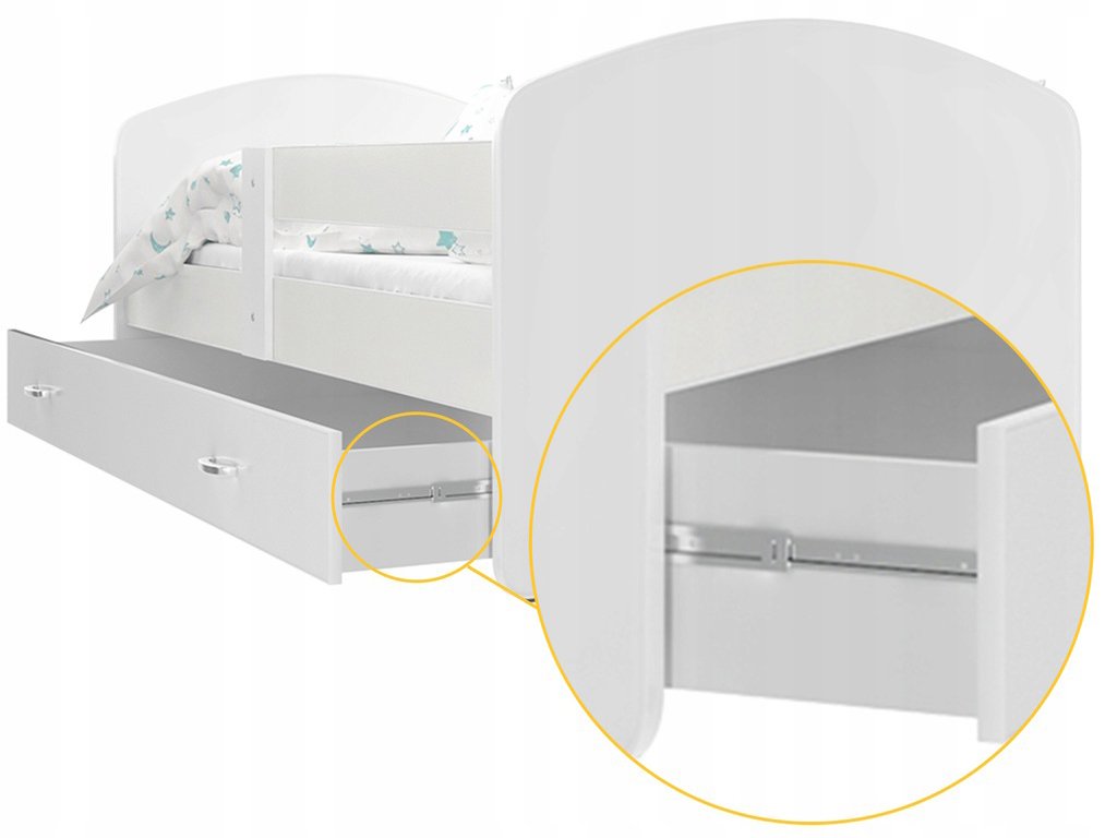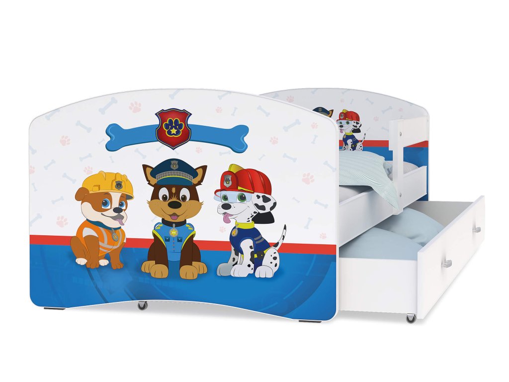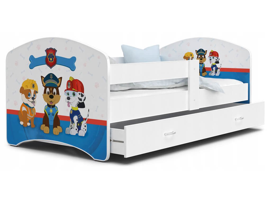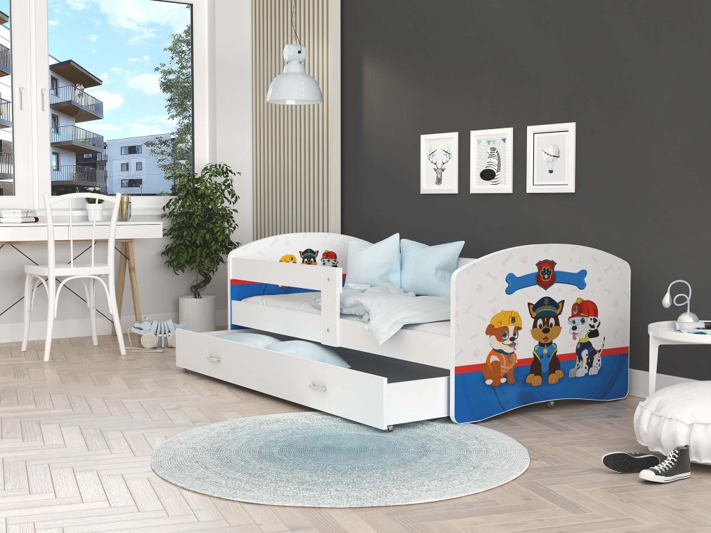 A gyerekágy semleges fehér színben készül egyedülálló Mancs őrjárat mintával. Az ágy tágas ágyneműtartó tároló fiókkal, ágyráccsal és leesésgátlóval együtt kapható. A Paw Patrol ágy laminált DTD és MDF bútorlapokból készült. Az ágyhoz rugalmas lamellás ágyrács tartozik, amely biztosítja a stabilitást és a kényelmes pihenést. Nagyon praktikusak az ágy leesésgátlói is, amelyek biztonságban tartják gyermekét az egész éjszaka folyamán. A leesésgátló kétoldalas. Biztosan hasznát veszi majd a praktikus ágyneműtartónak is, amely kerekeken mozgatható és elhelyezheti bele az ágyneműt vagy a gyerekek kisebb játékait.