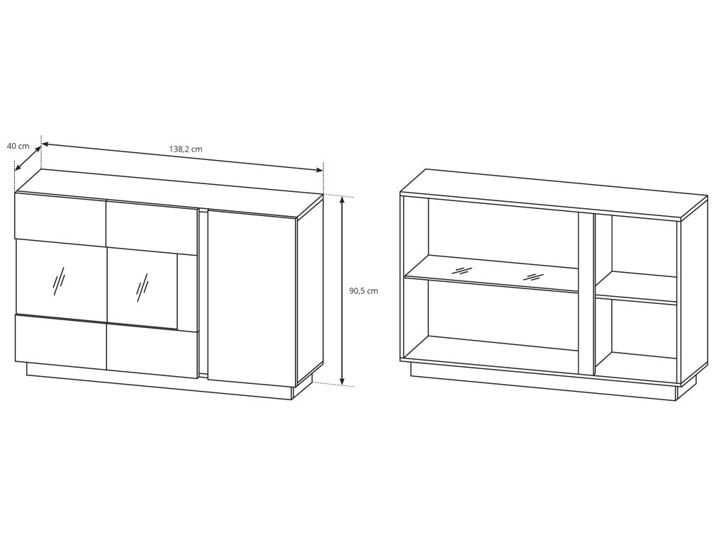 Penny 138 üveges háromajtós komód, a kettes üvegajtó mögött egy széles üvegpolc, valamint a komód jobb oldalán lévő ajtó mögött egy polc található. A termékek nem tartalmaznak LED világítást, de hozzárendelhető.