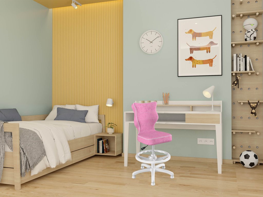A gyerekeink nagyon sok időt töltenek az iskolapadban vagy az íróasztaluknál. Ezért nagyon fontos, hogy legyen egy kényelmes és minőségi székük. Ez a szék biztosítja a megfelelő testtartást. A Petit fehér - rózsaszín kombinációban készült forgószék, amely nagyon jó választást jelent, ugyanis ergonomikusan formázott. Ennek köszönhetően a gyerekek medencéje a megfelelő helyzetbe kerül, amely elengedhetetlen a hátgerinc felső szegmenseinek megfelelő helyzetéhez. A Petit szék váza műanyagból és üvegszálakból készül. A szerkezet rendelkezik egy gázlifttel is, melynek köszönhetően állítható a magassága. A szék részét képezi egy praktikus kör alakú lábtartó is. A székhez tartozó puha kerekek lehetővé teszik, hogy a forgószék könnyen mozgatható legyen bármilyen felületen, akár a szőnyegen is. Ezt a típusú gyerekszéket egy ortopédiai, ergonómiai, biomechanikai és fizioterápiai szakértőkből álló csoport fejlesztette ki. Hozzon létre gyermekének egy helyet, ahol kényelmesen tanulhat, rajzolhat vagy kreatív tevékénységeket folytathat a Petit ergonomikus gyerek forgószéknek köszönhetően.
