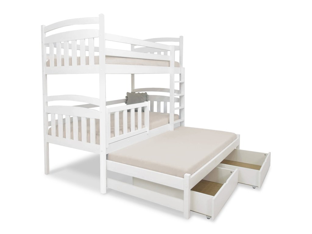 Fehér emeletes ágy kihúzható pótággyal (200x90 cm) tömör borovi fenyőből, amely stabil szerkezettel rendelkezik. A három fekhelyes ágy minőségi fából készült, kis szobákba vagy gyerekszobákba is tökéletes. Az emeletes ágy natúr színben kapható, 3x lakkozva természetre nem ártalmas ökológiai lakkal. Az ágy szétszedhető két különálló fekhelyre. Az ágy a pótágyon kívül két tároló fiókkal is rendelkezik, amelyek műanyag kerekeken mozognak, hogy ne sértsék meg a padlót. Nincsenek az ágyhoz rögzítve, így könnyen mozgathatók.A vendégágy kihúzható és így egy harmadik, teljes értékű fekhely alakítható ki. A pótágy hátsó lábaira kerekek vannak rögzítve, melyek lehetővé teszik a könnyű kezelését, vagyis a kihúzását és a betolását. Az ágy leesésgátlóval és ágyráccsal együtt kapható. Az ágy univerzális, tehát kétoldalas. Szerelés előtt döntheti el, hogy jobb vagy bal oldalra szeretné szerelni a létrát.