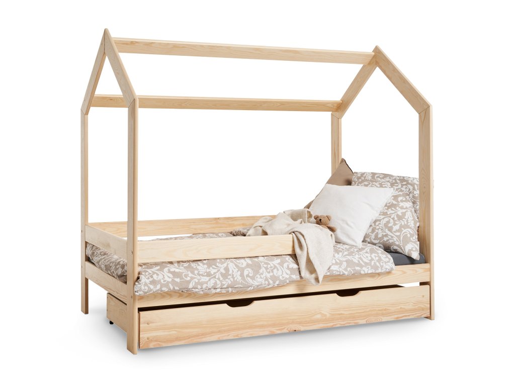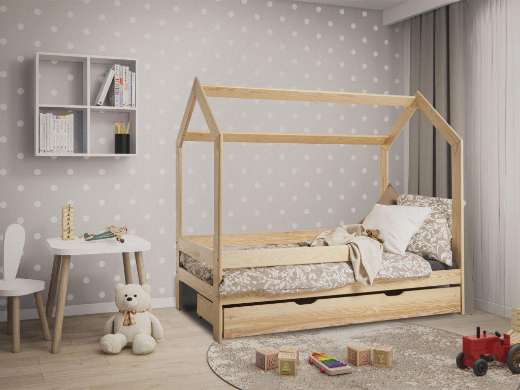 A PIETRO házikó formájú gyerekágy 80x140 cm masszív és stabil szerkezetével hívja fel magára a figyelmet, amely kiváló minőségű tömör borovi fenyőből készült natúr borovi színben. Az ágy része egy praktikus rövid leesésgátló és egy ágyneműtartó tároló fiók is, amely segít rendet tartani a gyerekszobában. Ez az ágy nemcsak alvásra szolgál, hanem teret biztosít a gyermeki fantáziának és a játéknak is. Az ágy tökéletes olyan gyerekeknek, akik már kinőtték a kiságyat, de még mindig kicsik egy nagyobb ágyhoz. Méretének köszönhetően kisebb gyerekszobákba is tökéletes.