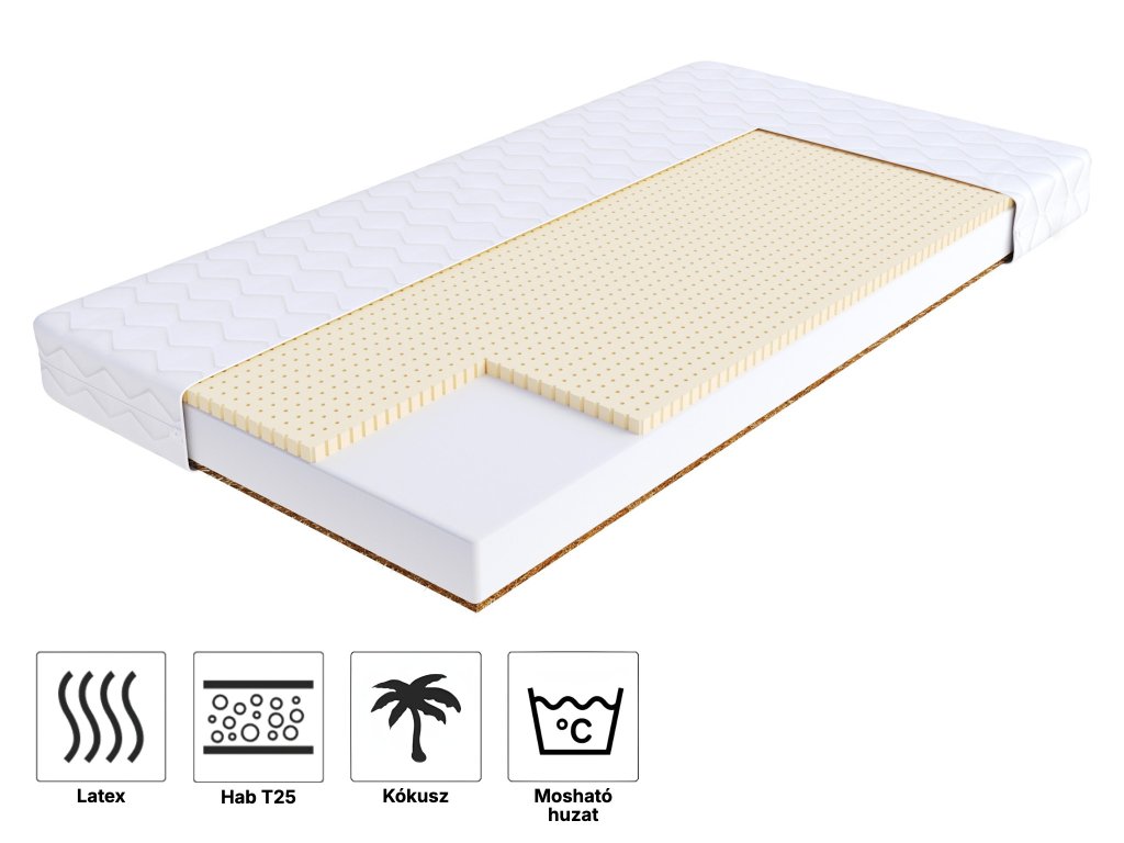Anyagösszetétel: Poliuretán hab, Kókuszréteg, Légáteresztő szövet, Latex, Huzat