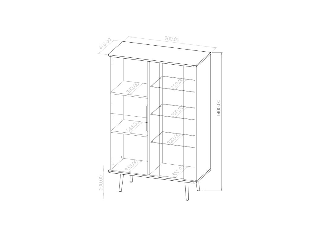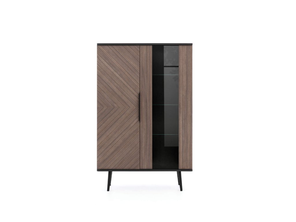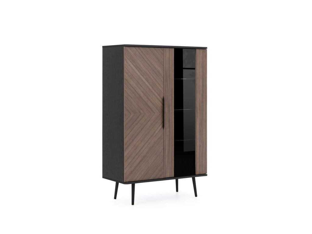 Elegáns PINELLI WIT2D üveges komód, amely igazán gyönyörű kinézettel rendelkezik. A vitrines rész helyet biztosít a dísztárgyainak vagy a családi képeinek. A kétajtós szekrény egyik ajtaja részben tehát üveges, e mögött pedig üveges polcok találhatók. Az ajtókat halszálka minta díszíti, amely egyedi stílust kölcsönöz neki. A vitrin fém fogantyúkkal és fekete magas fém lábakkal is rendelkezik. Ez a szekrény tökéletes kiegészítője a többi bútornak a Pinelli kollekcióból.