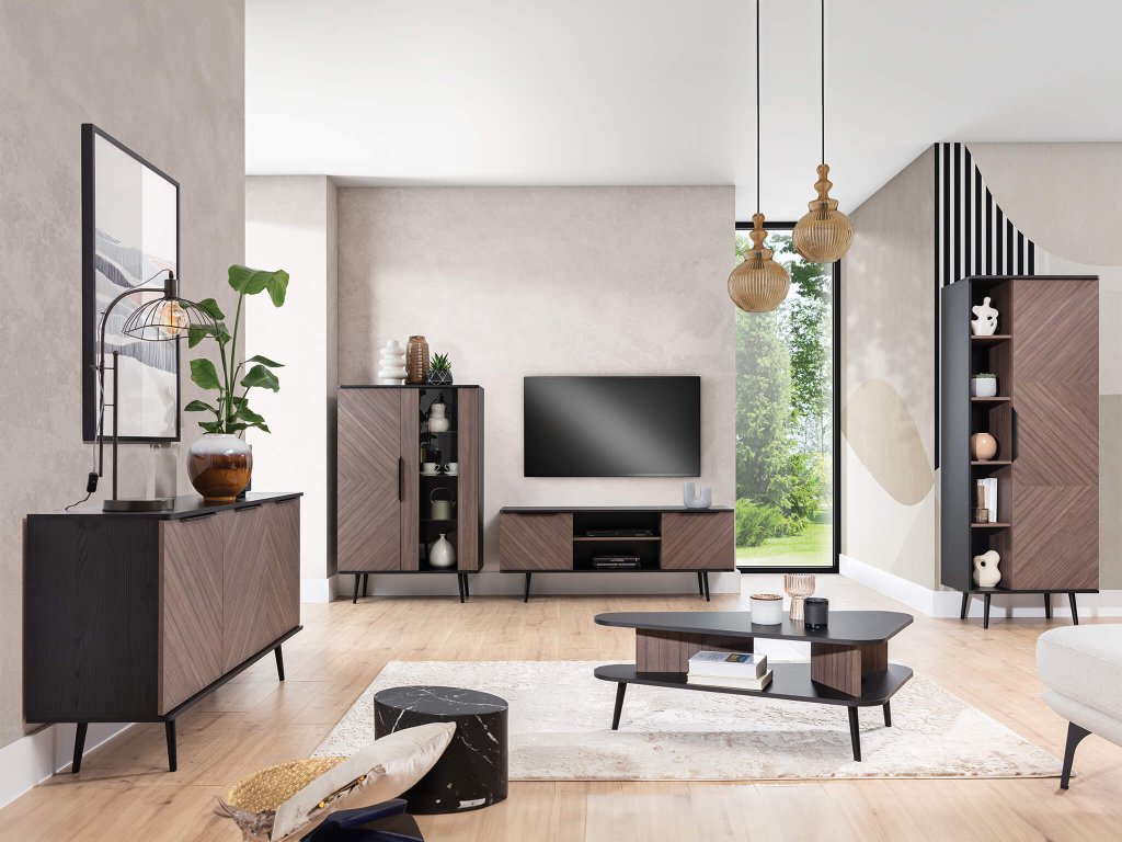 A PINELLI bútor kollekció tökéletes választást jelent a nappaliba. Modern designnal és számos praktikus tulajdonsággal rendelkezik, így a nappalin kívül más szobákban is megállja a helyét, mondjuk a dolgozószobában vagy a hálószobában. A bútor összeállítás tartalmaz komódokat, dohányzóasztalt, könyvespolcot, tévés szekrényt és üveges vitrint is. A bútorok előlapjai tölgyfa dió színben készülnek és halszálka mintával díszítettek. A Pinelli bútor család 16 mm vastag forgácslapból készül. A magas fekete fém lábak adják a kollekció eleganciáját és légiességét. Az egyes bútor elemek fekete fém foganyúkkal rendelkeznek. A bútor család tölgyfa dió és fekete szín kombinációjában készül, amely igazán elegáns és otthonos hatást kelt.