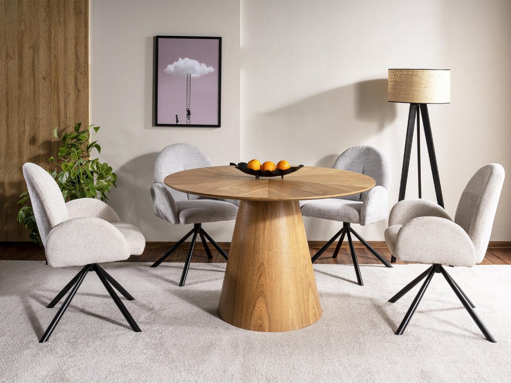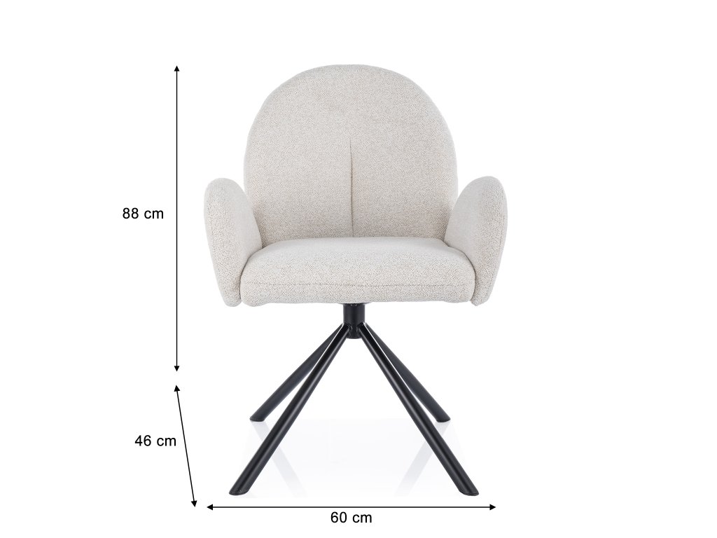A Planet modern forgó étkezőszék igazán ízléses és elegáns bútordarab. Ez a minőségi fotel stabil fém szerkezettel és kényelmes kartámlával is rendelkezik. A szék ráadásul még 180 fokban forog is, melynek köszönhetően garantálva van a rugalmas mozgása. A fekete fém lábak és a bézs kárpitozott ülőfelület kombinációja nagyon ízlésese és modern hatást kelt. Jó választást jelent a kerek és a négyszögletes étkezőasztalokhoz is.