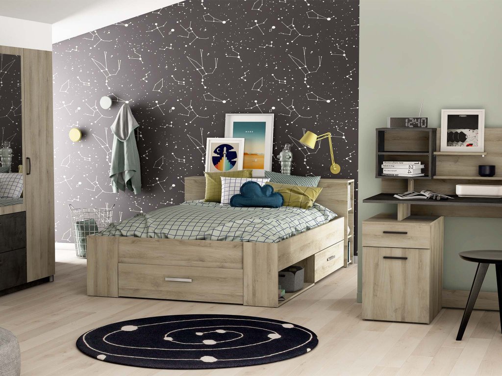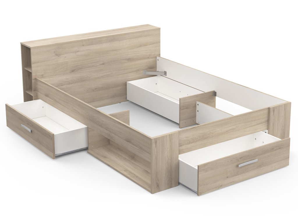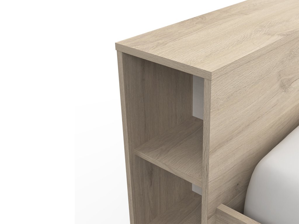 A praktikus megoldások az ágy alsó részében találhatók – három tágas, görgőkön mozgatható fiók, amelyek elegendő helyet biztosítanak az ágynemű, a párnák, a paplanok vagy a szezonális ruhák elhelyezésére. További tárolóhelyet jelent a nyolc nyitott rekesz az ágy oldalain és a fejtámla szélén, amelyek ideálisak a könyvek, a dekorációk vagy a személyes tárgyak elhelyezésére.