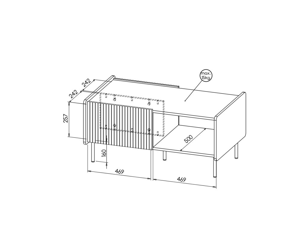 PRESTIGO P11 dohányzóasztal, amely egy praktikus és modern bútor darab minden otthonba. Két szekrénnyel rendelkezik, ahová elhelyezheti az apróságait, amelyeket keze ügyében szeretne tudni. Mellettük egy tágas nyitott polc található, amely további tároló helyet biztosít. A gyönyörű színeinek köszönhetően feldob minden szobát. A 16 cm magas 5 fém láb pedig biztosítja a stabilitását.