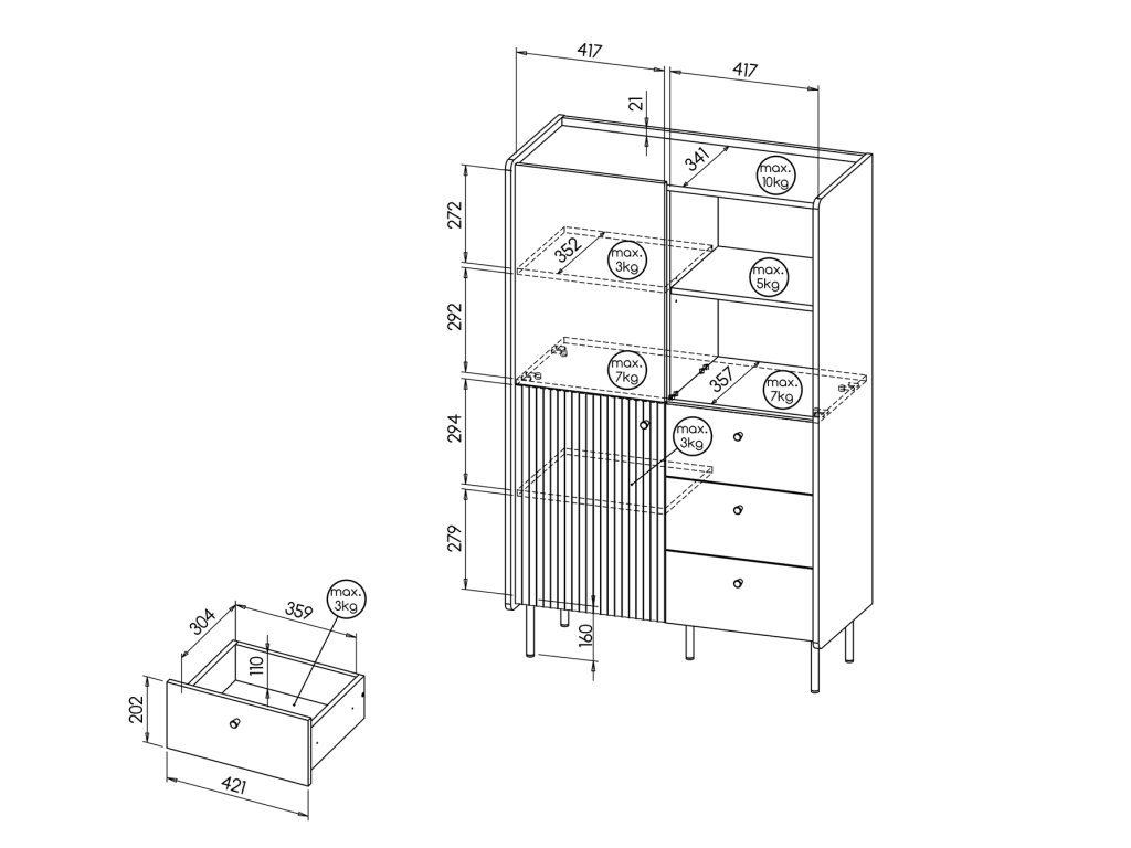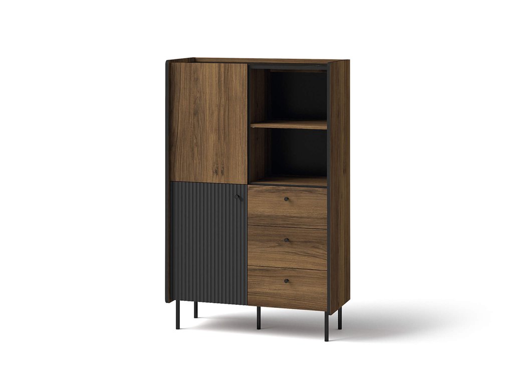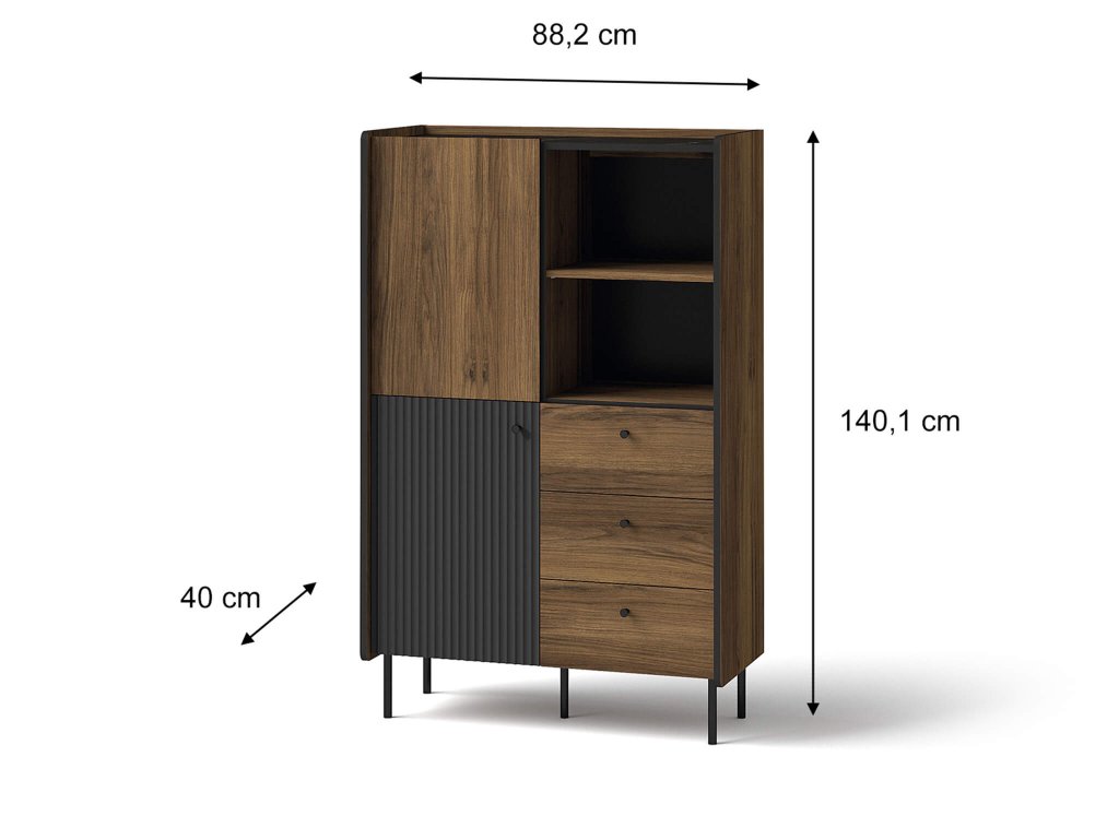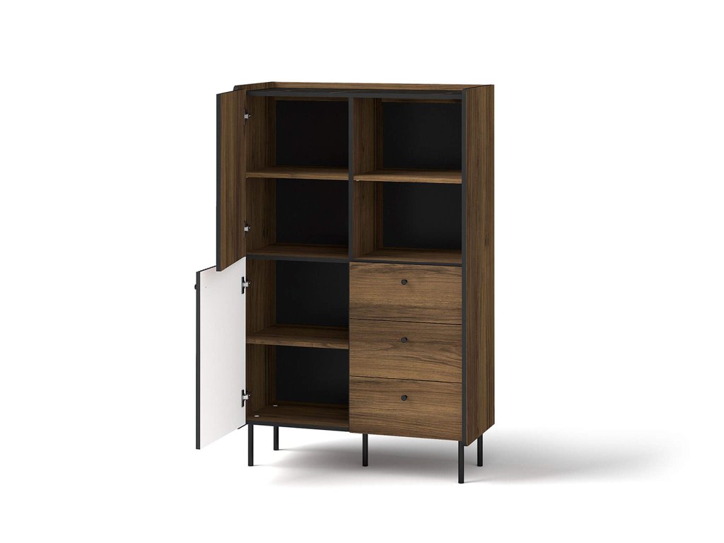A Prestigo P4 polcos komód az egyszerű forma és az elegáns modern stílus kombinációja. A szekrényajtók mögött négy polc található, a jobb felső sarokban pedig további két nyitott polc. A nyitott polcok alatt három tágas fiók van, amelyekbe különféle tárgyait rejtheti el. A bútor egyedi dizájnját olyan válogatott színkombináció biztosítja, mint a dió warmia, a San Sebastian és a matt fekete. A polcos szekrény öt darab 16 cm-es fekete fém lábbal rendelkezik, amelyek hosszú évekig biztosítják a stabilitását.