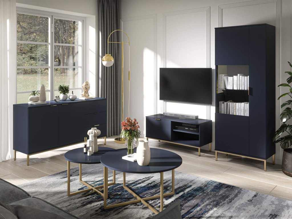 A PULA nappali bútor kollekció egy modern, luxusos és elegáns bútor család, amely minden otthonba stílust és kényelmet visz. A designjának és a tulajdonságainak köszönhetően egy igazán egyedi nappalit hozhat létre vele, amely minden nap megörvendezteti majd. A kollekció egyik legszembetűnőbb eleme a modern jelleg. A bútor minden szobában magára vonja a tekintetet a sötétkék színének köszönhetően, amely arany színű lábakkal és fogantyúkkal van kiegészítve. A bútor családra jellemzőek a letisztult vonalak, a minimalista karakter és az időtálló elegancia. A kollekció különböző bútordarabokból áll, tartalmaz komódokat, vitrint, tévés szekrényt és dohányzóasztalt is. Ezeknek a bútoroknak köszönhetően rengeteg tároló helyet kap egy elegáns és praktikus nappali formájában. Az egyes bútordarabok 16 mm vastag forgácslapból készültek ABS élzárással, amely biztosítja a bútorok ellenálló képességét és a hosszú élettartamát. A fém lábak és fogantyúk teszik fel az i-re a pontot. A csendes záródó rendszerrel ellátott bútorpántok biztosítják az ajtók és fiókok sima és csendes kezelését.