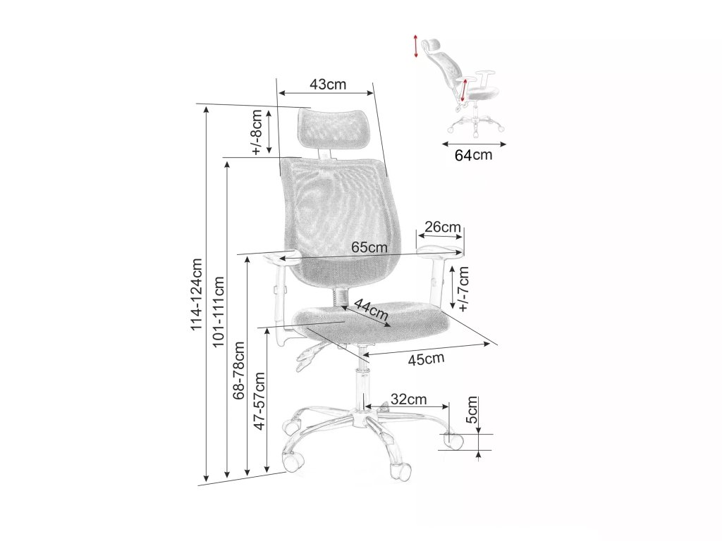 - Szék mérete (SzéxMaxMé): 65 x 114-124 x 64 cm