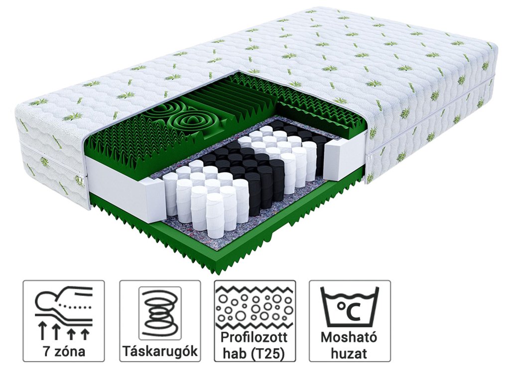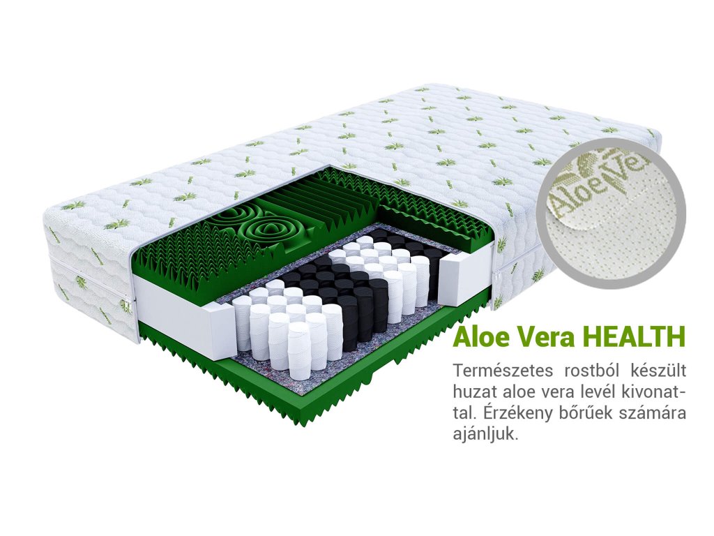 Kétoldalas matrac cipzáras huzattal, amely mosógépben mosható 30°C-on. Az Aloe Vera huzat antiallergén és antibakteriális tulajdonságokkal rendelkezik, melynek köszönhetően allergiások számára is megfelelő. Speciális szálakból készült, amelyek aloe vera levél kivonatával vannak átitatva. A huzat védi a matracot a szennyeződésektől és a baktériumoktól.