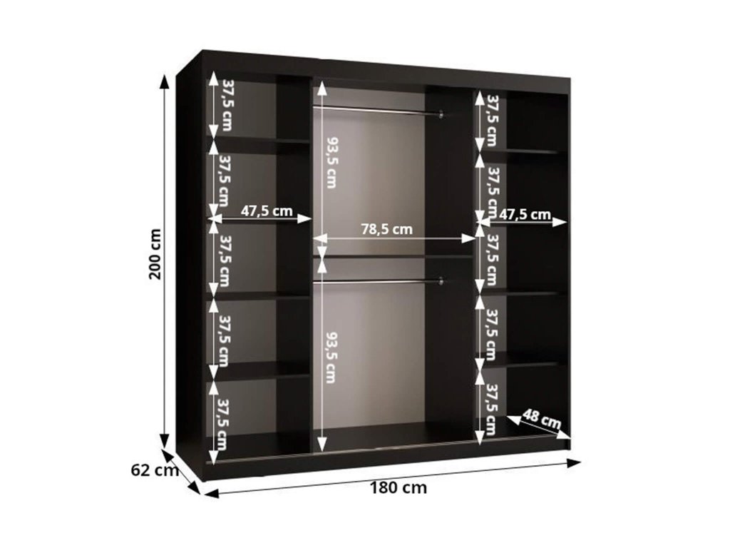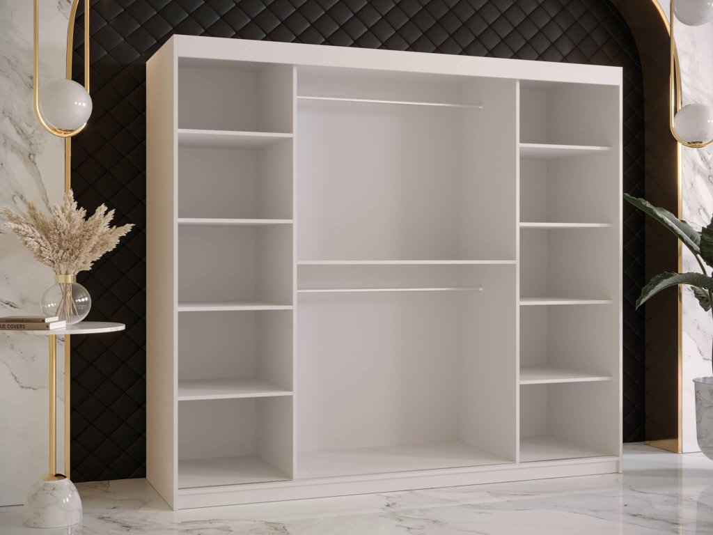 Vigyen új színt az otthonába a modern tükörrel ellátott gardróbszekrény segítségével. A fehér RAMIRO II 180 és 200 tükrös ruhásszekrény tolóajtókkal ideális választás minden otthonba. Elegendő tároló helyet biztosít, de emellett elegáns megjelenéssel is rendelkezik. A szekrény egyik ajtajára egy praktikus tükröt helyeztek el, amely optikailag tágítja a teret. A ruhásszekrény egy igazán praktikus bútor darab a hálószobába, a folyosóra vagy az előszobába is. Minőségi 16 mm vastag laminált bútorlapból (DTD) készül, amely ellenálló a karcolásokkal, a nedvességgel és a magas hőmérséklettel szemben. A szekrény ajtajai 18 mm vastag MDF bútorlapból készültek hullámos mintával. A szekrény szélei PVC furnérral vannak biztosítva. A fogantyúk műanyagból készültek arany színben. Az ajtók kényelmes és halk kinyitását és becsukását a ,,BIMAK” tolóajtó rendszer biztosítja (alumínium síneken). A szekrény három részre van osztva. A ruhásszekrény közepén a két akasztórúd elegendő tárolóhelyet biztosít, a jobb és a bal szélében lévő négy polc pedig áttekinthetővé teszi a ruhákat.