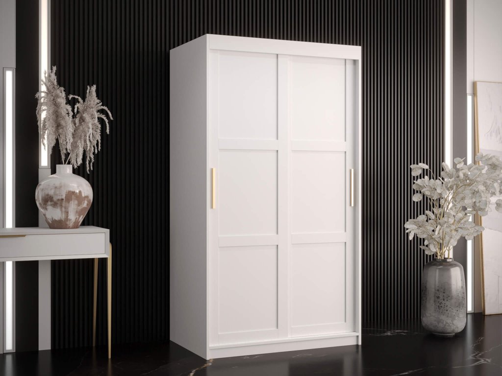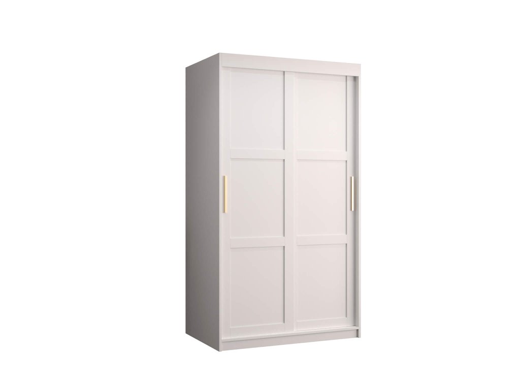 Válassza a minőségi fehér RAMIRO 100/120 tolóajtós ruhásszekrény, amelynek ajtajai mögött számos tároló helyet talál majd. Minőségi 16 mm vastag laminált bútorlapból (DTD) készül, amely ellenálló a karcolásokkal, a nedvességgel és a magas hőmérséklettel szemben. A szekrény designos ajtajai 18 mm vastag MDF bútorlapból készültek. A szekrény szélei PVC furnérral vannak biztosítva. A fogantyúk műanyagból készültek arany színben. Az ajtók kényelmes kinyitását és becsukását a ,,BIMAK” tolóajtó rendszer biztosítja (alumínium síneken). A szekrény bal oldalán a két akasztórúd elegendő tároló helyet biztosít, a jobb oldalon lévő négy polc pedig áttekinthetővé teszi a ruhákat. A modern gardróbszekrény tökéletes választás a hálószobába, a folyosóra vagy az előszobába is.