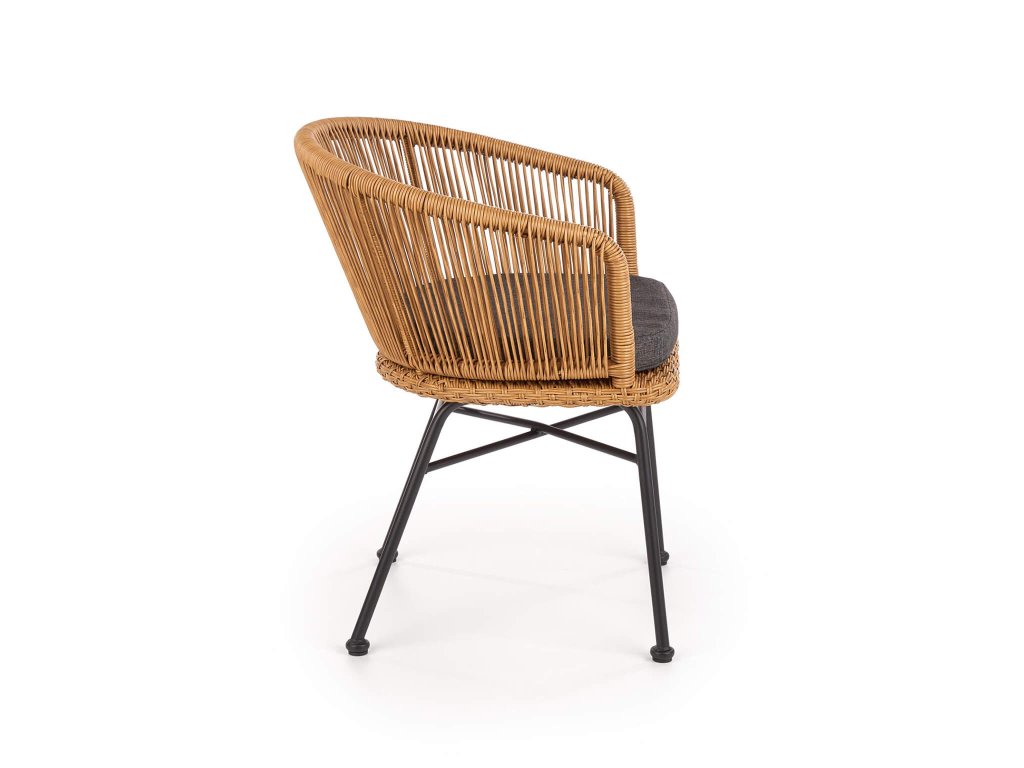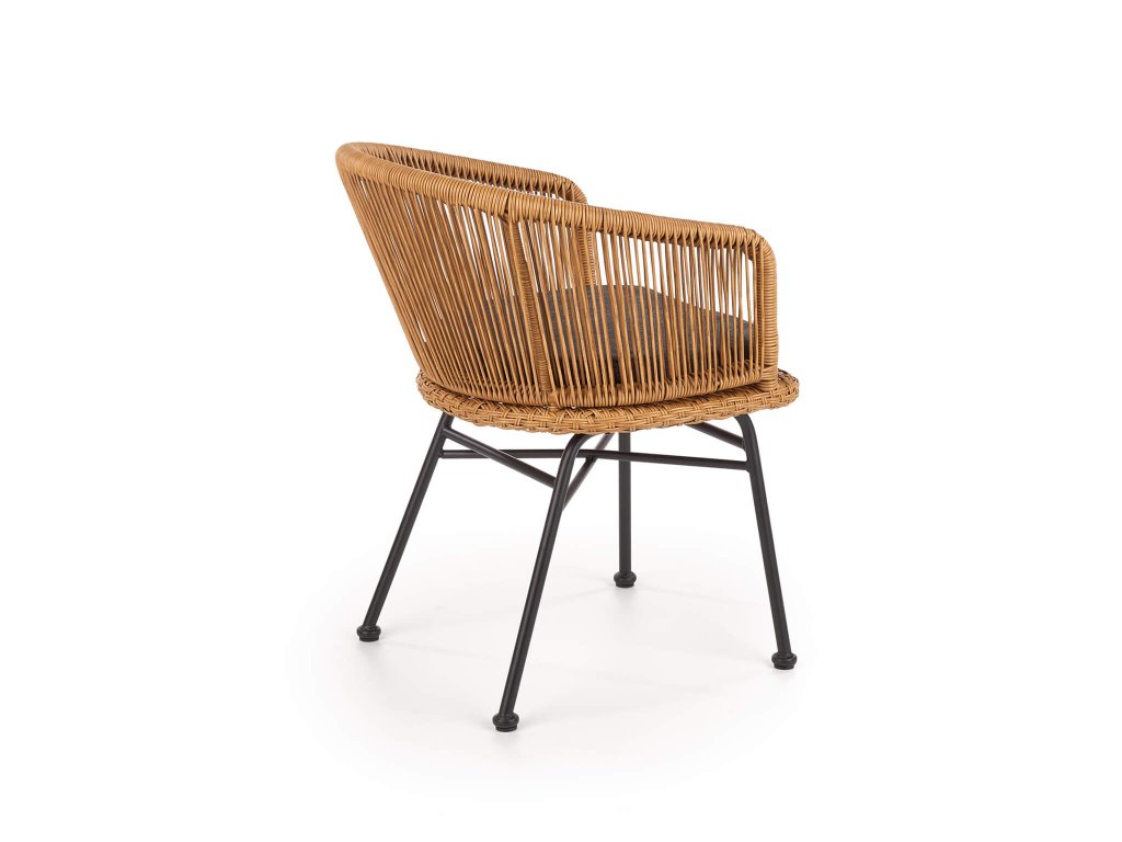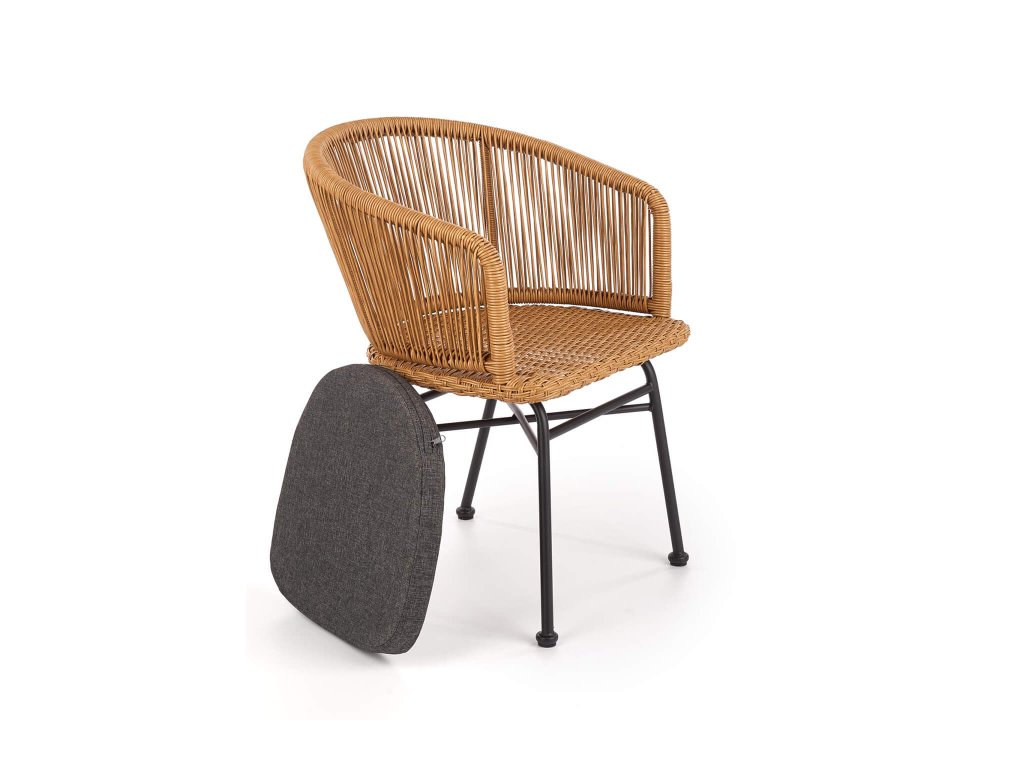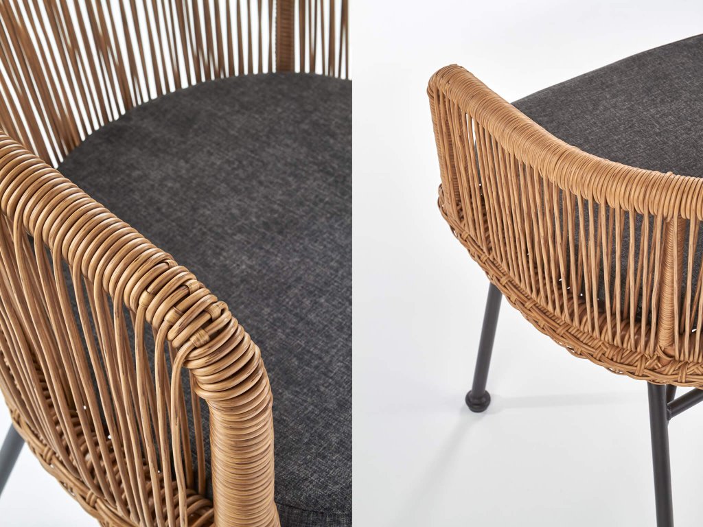Modern és kényelmes K400 kerti rattan fotel puha párnával, amelyet elhelyezhet a téli kertbe, a teraszra vagy az erkélyre. Azonban az érkezőben, a konyhában vagy a pavilonban is megállja a helyét. Az originális designjának és a kifinomult kinézetének köszönhetően mindenkit levesz a lábáról ez a boho stílusú fotel. A kültérben és a beltérben is tökéletesen megállja a helyét, továbbá a rusztikus és a skandináv stílusú bútorokkal is könnyen kombinálható. Élvezze a családdal és a barátokkal töltött időt a szabadban ennek a kényelmes fotelnak a segítségével. A fotel szintetikus rattanból készül, amely kinti használatra is tökéletes. A fekete fém szerkezet nagyon stabil és biztonságos. A fotel lábain egy kerek talapzat található, amely megvédi a padlót a karcolásoktól.