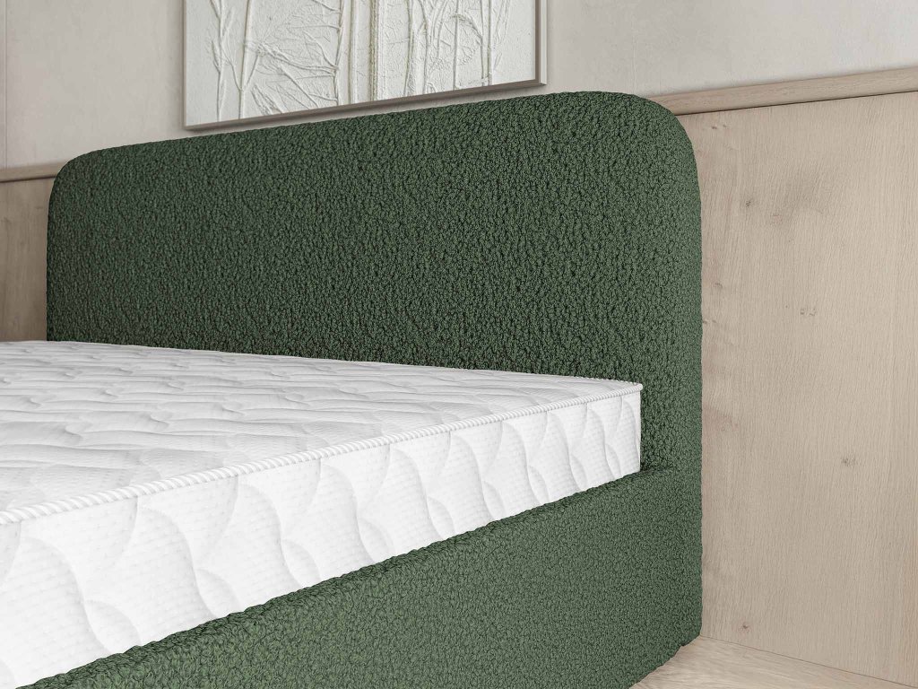 Első érintésre lenyűgöz a Renive Q ágy tárolóhellyel a Quelle szövet kárpitozásával. Ez a prémium anyag buklé (báránybőr) struktúrával finom és elegáns hatást kelt, ugyanakkor kiemelkedik praktikusságával. Az olíva árnyalat természetes harmóniát hoz a belső térbe, és otthonossá teszi a helyiséget. A szövet kopásálló, és megőrzi megjelenését a mindennapi igénybevétel mellett is, így az ágy évek múltán is újnak fog tűnni.