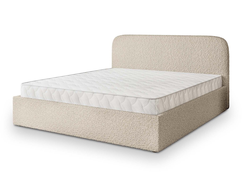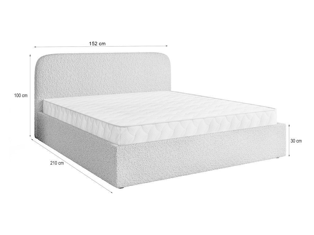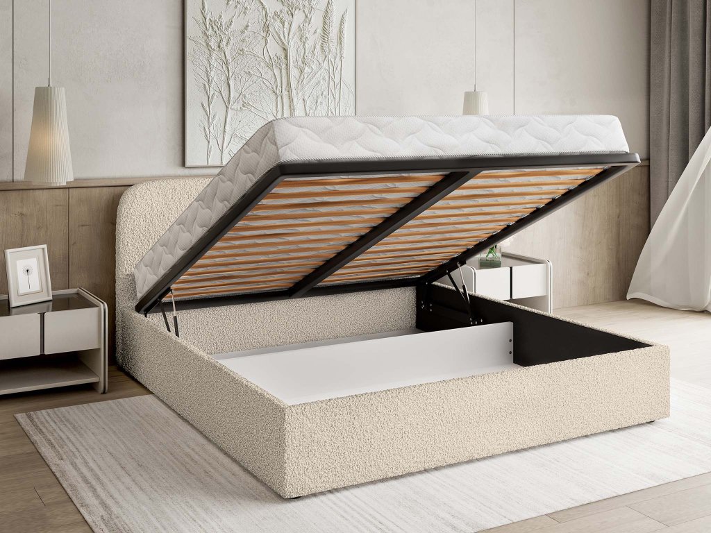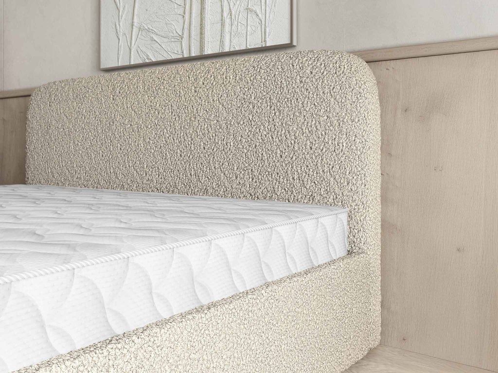 Bézs Quelle szövetverzió jellegzetes buklé struktúrával finomságot és könnyedséget hoz a belső térbe. Puha felülete nemcsak kellemes tapintású, hanem nagyon tartós is. A kopásállóságnak köszönhetően a szövet megőrzi vonzó megjelenését hosszú távú használat után is. A Renive Q ágy így nemcsak a hálószoba domináns eleme lesz, hanem egy praktikus megoldás is, amely kiemelkedik eleganciájával és funkcionalitásával.