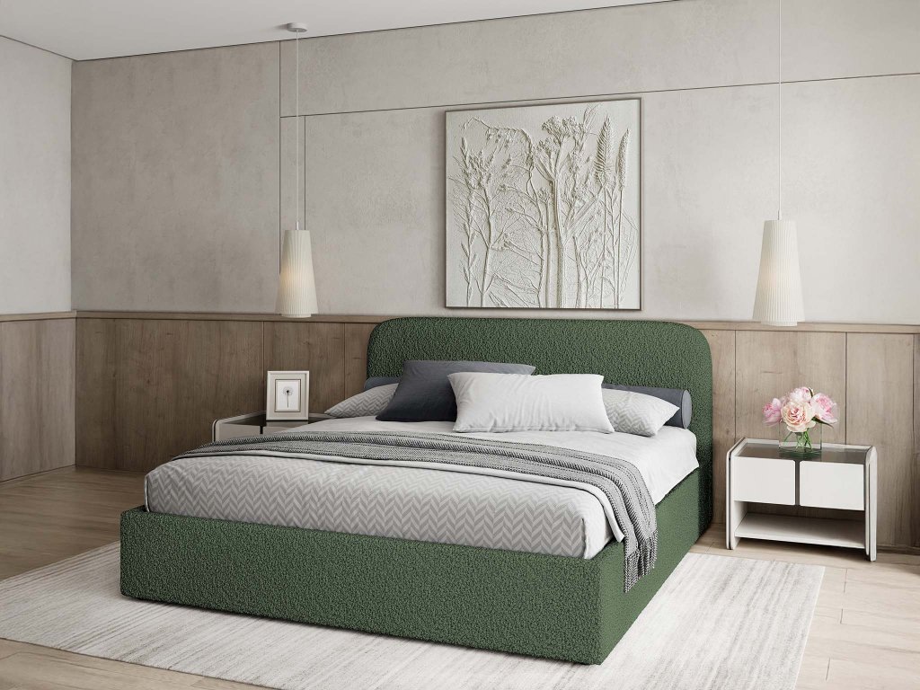 Quelle szövet buklé „báránybőr” felületével egyedi puhaságot és eleganciát kölcsönöz. Olíva színben nyugodt és harmonikus hatást kelt, így könnyen illeszkedik a modern és hagyományos belső terekbe egyaránt. Tartóssága és kopásállósága garantálja, hogy az ágy megőrzi megjelenését még intenzív használat után is. Ez a részlet teszi a Renive Q kárpitozott ágyat, amely magas szinten ötvözi az esztétikát a funkcionalitással.
