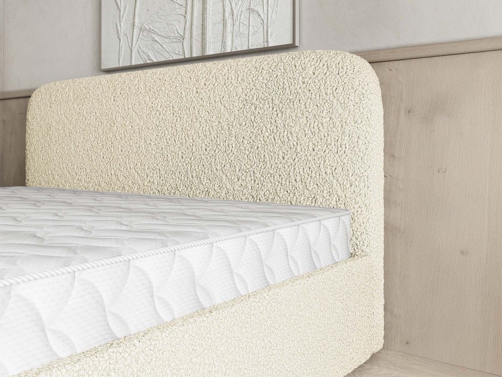 Az exkluzív Quelle szövet jellegzetes buklé „bárány” struktúrával luxus hatást kelt, és nagyon kellemes tapintású. A krémszínű változat világosságot ad a belső térnek, és optikailag növeli a teret. Kopásálló, így az ágy szépségét és funkcionalitását évekig megőrzi. A krémszínű Renive Q nemcsak esztétikailag vonzó, hanem praktikus választás a mindennapi kényelemhez. Pasztell színű kiegészítőkkel kombinálva nyugalmat és harmóniát teremt.