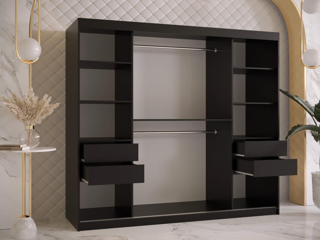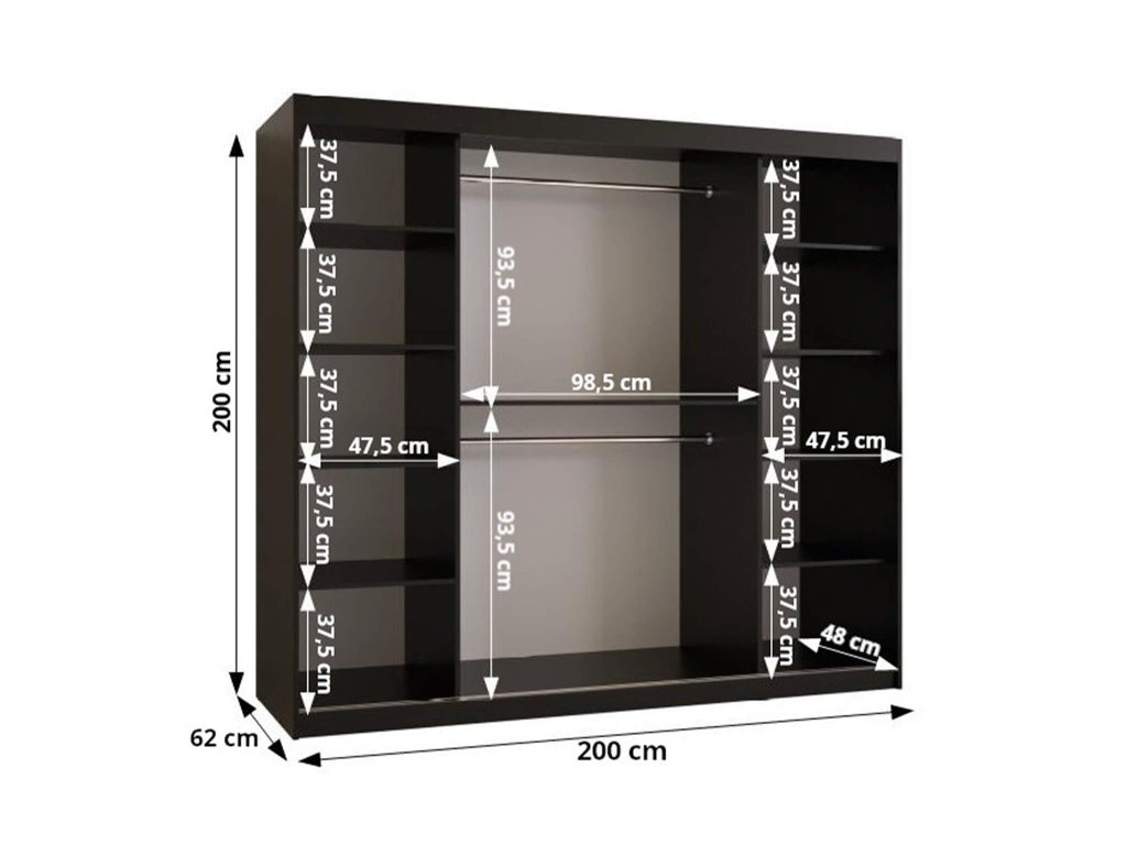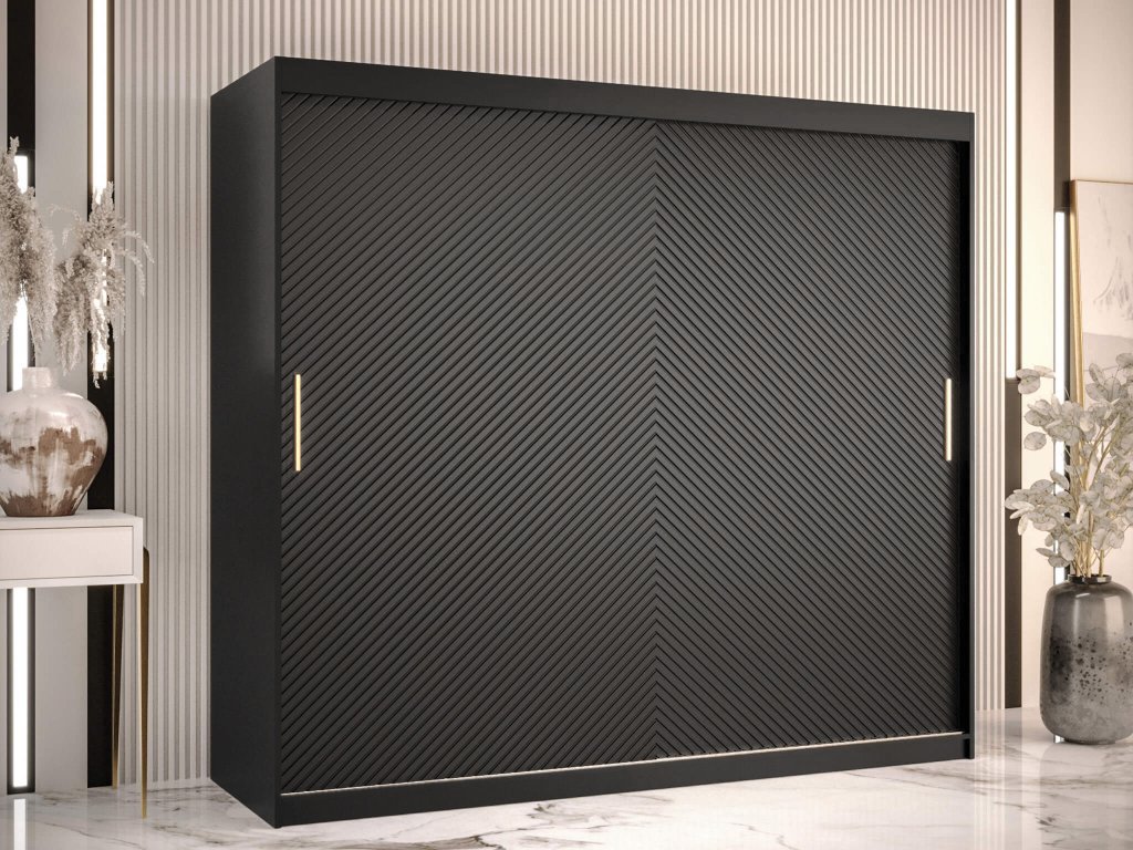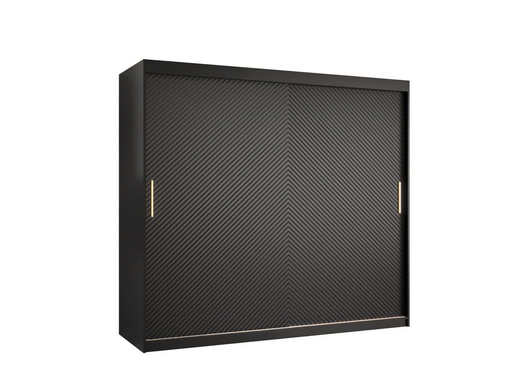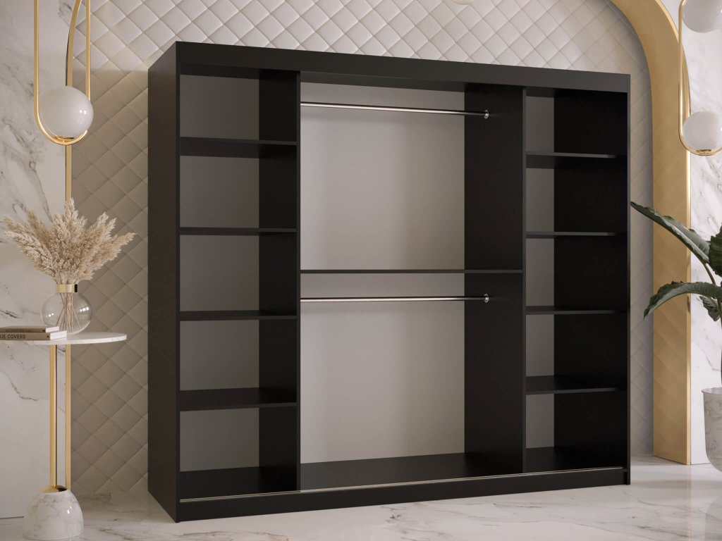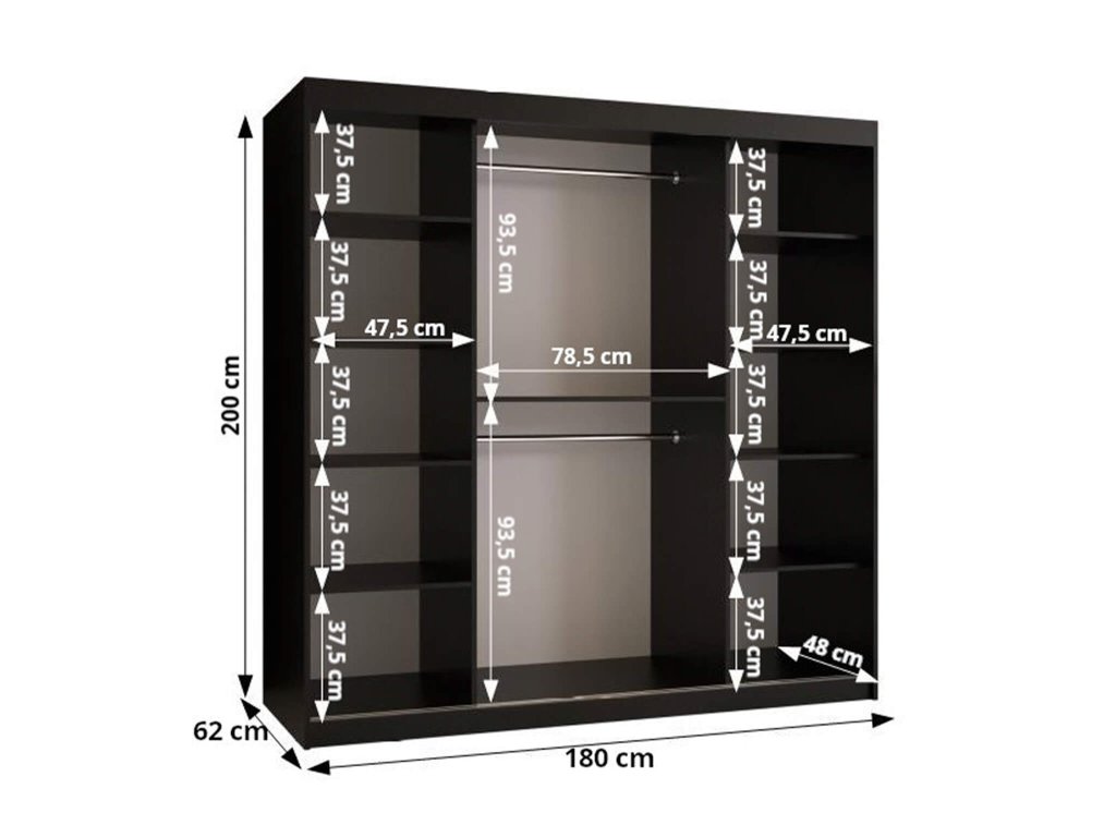 Élvezze, hogy minden ruhája rendben és praktikusan elhelyezve találja meg a helyét. Az elegáns fekete Riflo Slim 180/200 tolóajtós gardróbszekrénynek köszönhetően rendben tudhatja a ruháit. Minőségi 16 mm vastag laminált bútorlapból (DTD) készül, amely ellenálló a karcolásokkal, a nedvességgel és a magas hőmérséklettel szemben. A szekrény ajtajai 18 mm vastag MDF bútorlapból készültek mart mintával. A szekrény szélei PVC furnérral vannak biztosítva. A fogantyúk műanyagból készültek arany színben. Az ajtók kényelmes kinyitását és becsukását a ,,BIMAK” tolóajtó rendszer biztosítja (alumínium síneken). A szekrény három részre van osztva. A ruhásszekrény közepén a két akasztórúd elegendő tárolóhelyet biztosít, a jobb és a bal szélében lévő négy polc pedig áttekinthetővé teszi a ruhákat. A modern gardróbszekrény tökéletes választás a hálószobába, a folyosóra vagy az előszobába is.