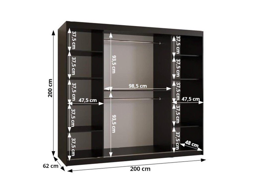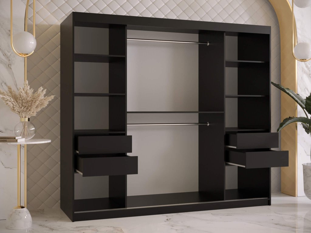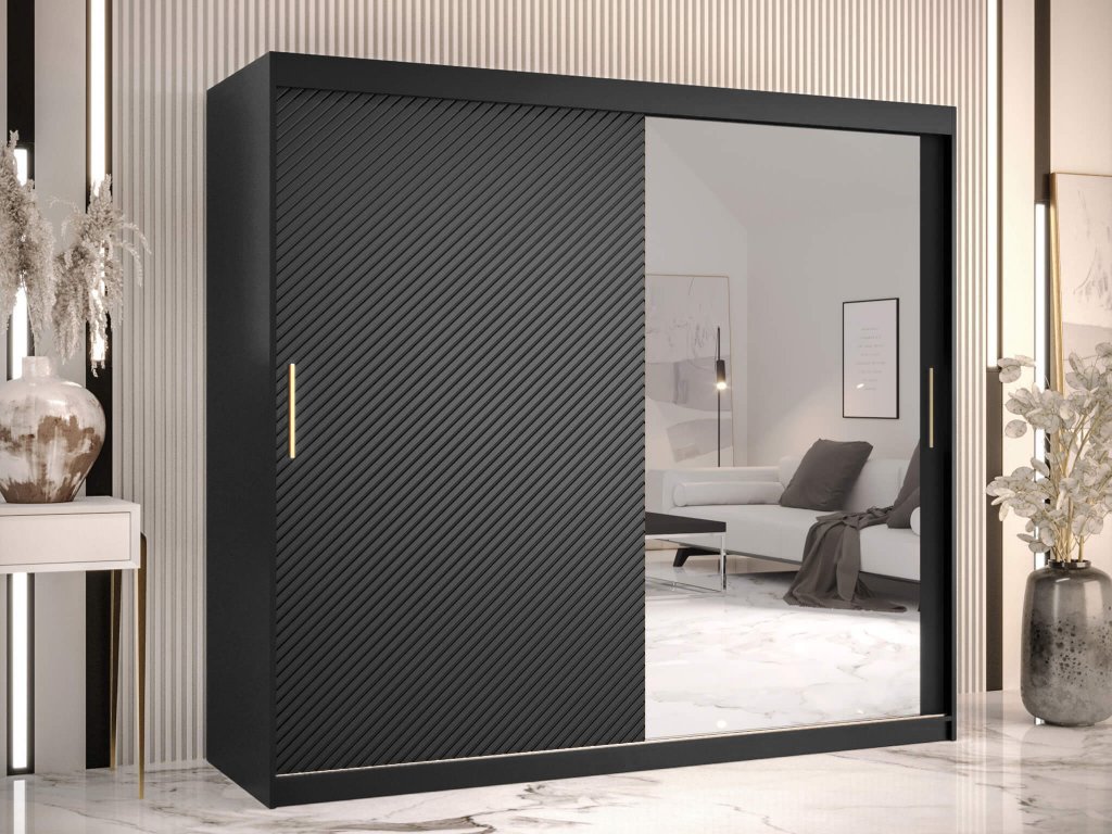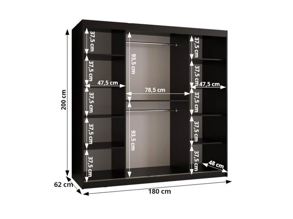Tárolja a ruháit az elegáns széles fekete gardróbszekrényben, amely remek választást jelent minden otthonba. A fekete Riflo Slim II 180 és 200 ruhásszekrény nem csak számos tároló helyet kínál, de a színének köszönhetően eleganciát visz a szobába. Az ajtón található tükör nem csak praktikus elem, de optikailag is megnagyobbítja a teret. A ruhásszekrény egy igazán praktikus bútor darab a hálószobába, a folyosóra vagy az előszobába is. Minőségi 16 mm vastag laminált bútorlapból (DTD) készül, amely ellenálló a karcolásokkal, a nedvességgel és a magas hőmérséklettel szemben. A szekrény ajtajai 18 mm vastag MDF bútorlapból készültek mart mintával. A szekrény szélei PVC furnérral vannak biztosítva. A fogantyúk műanyagból készültek arany színben. Az ajtók kényelmes kinyitását és becsukását a ,,BIMAK” tolóajtó rendszer biztosítja (alumínium síneken). A szekrény három részre van osztva. A ruhásszekrény közepén a két akasztórúd elegendő tároló helyet biztosít, a jobb és a bal szélében lévő négy polc pedig áttekinthetővé teszi a ruhákat.