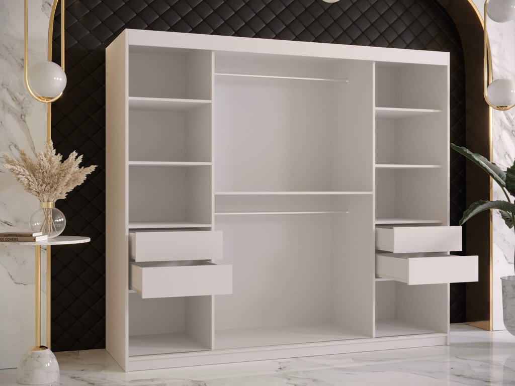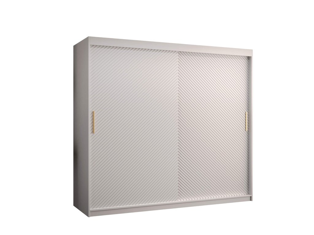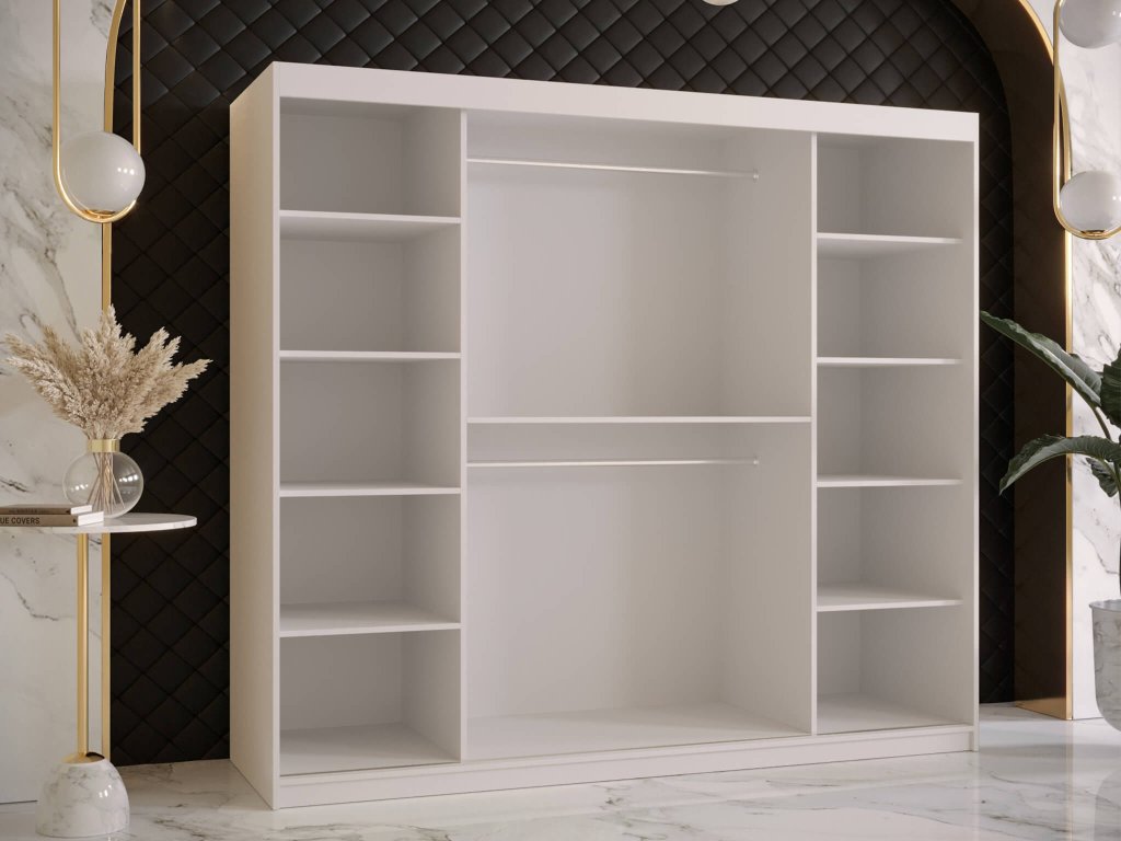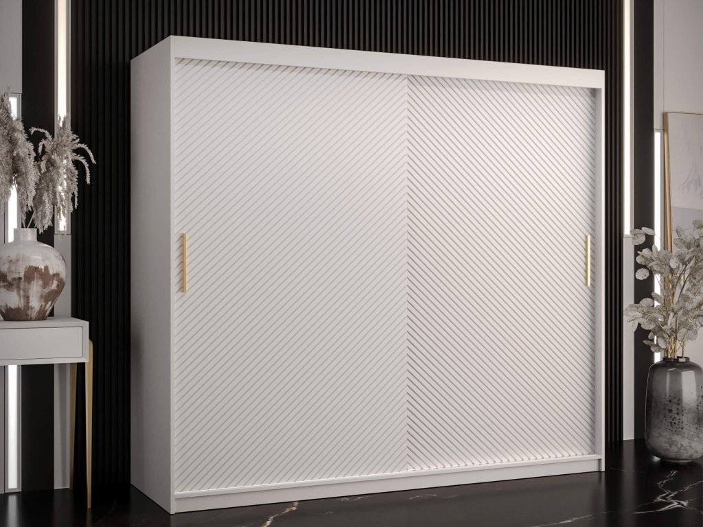 Egy tágas gardróbszekrényt keres a hálószobába? A fehér Riflo Slim 180/200 tolóajtós ruhásszekrénynek köszönhetően rendben tudhatja a ruháit. Minőségi 16 mm vastag laminált bútorlapból (DTD) készül, amely ellenálló a karcolásokkal, a nedvességgel és a magas hőmérséklettel szemben. A szekrény ajtajai 18 mm vastag MDF bútorlapból készültek mart mintával. A szekrény szélei PVC furnérral vannak biztosítva. A fogantyúk műanyagból készültek arany színben. Az ajtók kényelmes kinyitását és becsukását a ,,BIMAK” tolóajtó rendszer biztosítja (alumínium síneken). A szekrény három részre van osztva. A ruhásszekrény közepén a két akasztórúd elegendő tároló helyet biztosít, a jobb és a bal szélében lévő négy polc pedig áttekinthetővé teszi a ruhákat. A modern gardróbszekrény tökéletes választás a hálószobába, a folyosóra vagy az előszobába is.