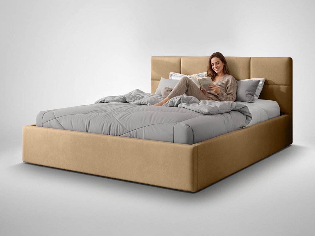 Első pillantásra magával ragad a meleg barna árnyalatban készült, letisztult és elegáns kivitelezés, amely a modern stílust az otthonos hangulattal ötvözi. A magas, karakteres ágytámla precíz, téglalap alakú steppeléssel díszített, amely egyedi megjelenést ad az ágynak, és tökéletes, puha támaszt nyújt hosszabb olvasáshoz, reggeli pihenéshez vagy filmnézéshez. A 160×200 cm-es méret elegendő teret biztosít a nyugodt regenerálódáshoz, így hálószobája valódi pihenőoázissá válik. A fa és laminált bútorlap kombinációjából készült masszív szerkezet stabilitást, hosszú élettartamot és megfelelő szellőzést garantál a matrac számára. Az ágy csúszótalpakon áll, és tágas ágyneműtartóval rendelkezik, amely a gázrugós mechanizmusnak köszönhetően könnyedén, simán és erőfeszítés nélkül nyitható.
