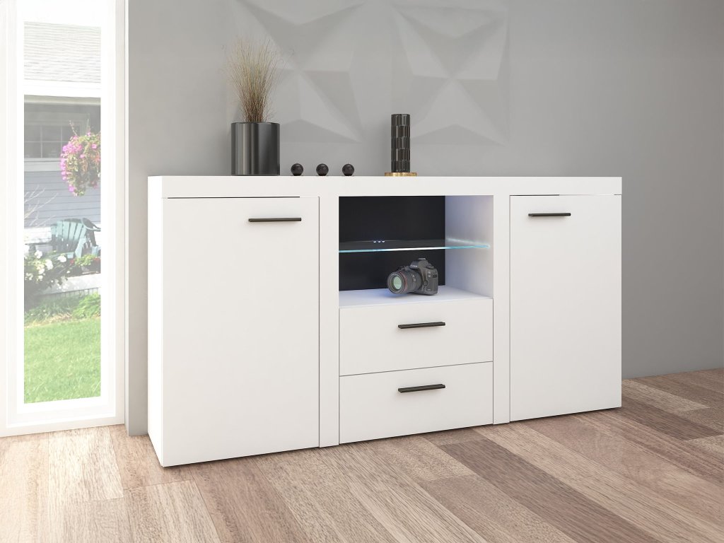 A RUMBA elegáns fehér komód 2 ajtós kis szekrénnyel, nyitott polcokkal és 2 fiókkal is rendelkezik. Ha a modern dizájnt szeretné ötvözni a praktikus tároló hellyel, akkor ezt a komódot Önnek találták ki. A komód minőségi anyagokból készült, így hosszú élettartamot és tartósságot garantál. A két ajtó mögött egy-egy polc található.