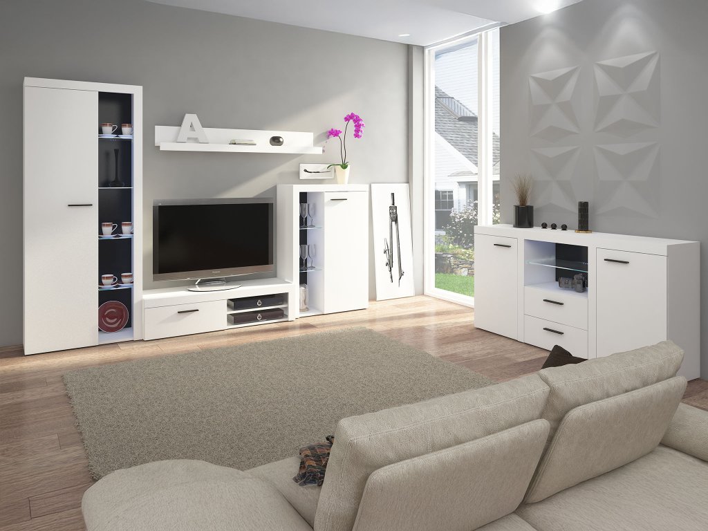 A RUMBA nappali bútor garnitúra bútorai jó választást jelenthetnek, amennyiben elegáns bútorokat keres a nappalijába. A kollekció tartalmaz három különböző méretű komódot, egy nappali falat tévés szekrénnyel, polccal és két vitrinnel. A bútor családba tartozó komódok azonban nem csak a nappaliban, de a hálószobában, az előszobában vagy a dolgozószobában is megállják a helyüket. A LED világítás nem képezi a bútorok részét. Igazán szépek és sok tároló helyet biztosítanak. A Rumba bútor kollekció három gyönyörű színváltozatban is elérhető: sonoma tölgy, lefkas tölgy és fehér színekben. Ennek köszönhetően mindenki könnyen ki tudja választani azt a színt, amely a legmegfelelőbb az otthonába. A szett darabjai laminált forgácslap, HDF és átlátszó üveg felhasználásával készültek. Az ajtókon és fiókokon műanyag fogantyúk találhatók, melyeknek hála könnyebben ki tudja nyitni őket.