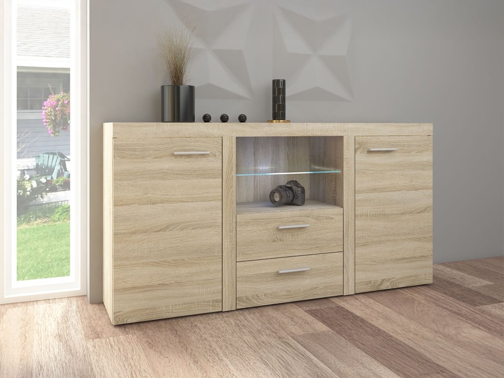 A sonoma tölgy színű RUMBA komód tökéletes választás lehet minden nappaliba. A komód 2 ajtós kis szekrénnyel, nyitott polcokkal és 2 fiókkal is rendelkezik. Ha a modern dizájnt szeretné ötvözni a praktikus tároló hellyel, akkor ezt a komódot Önnek találták ki. A komód minőségi anyagokból készült, így hosszú élettartamot és tartósságot garantál. A két ajtó mögött egy-egy polc található.