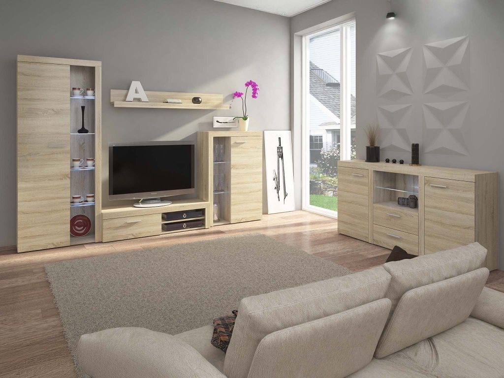 A RUMBA nappali bútor garnitúra bútorai jó választást jelenthetnek, amennyiben elegáns bútorokat keres a nappalijába. A kollekció tartalmaz három különböző méretű komódot, egy nappali falat tévés szekrénnyel, polccal és két vitrinnel. A bútor családba tartozó komódok azonban nem csak a nappaliban, de a hálószobában, az előszobában vagy a dolgozószobában is megállják a helyüket. A LED világítás nem képezi a bútorok részét. Igazán szépek és sok tároló helyet biztosítanak. A Rumba bútor kollekció három gyönyörű színváltozatban is elérhető: sonoma tölgy, lefkas tölgy és fehér színekben. Ennek köszönhetően mindenki könnyen ki tudja választani azt a színt, amely a legmegfelelőbb az otthonába. A szett darabjai laminált forgácslap, HDF és átlátszó üveg felhasználásával készültek. Az ajtókon és fiókokon műanyag fogantyúk találhatók, melyeknek hála könnyebben ki tudja nyitni őket.
