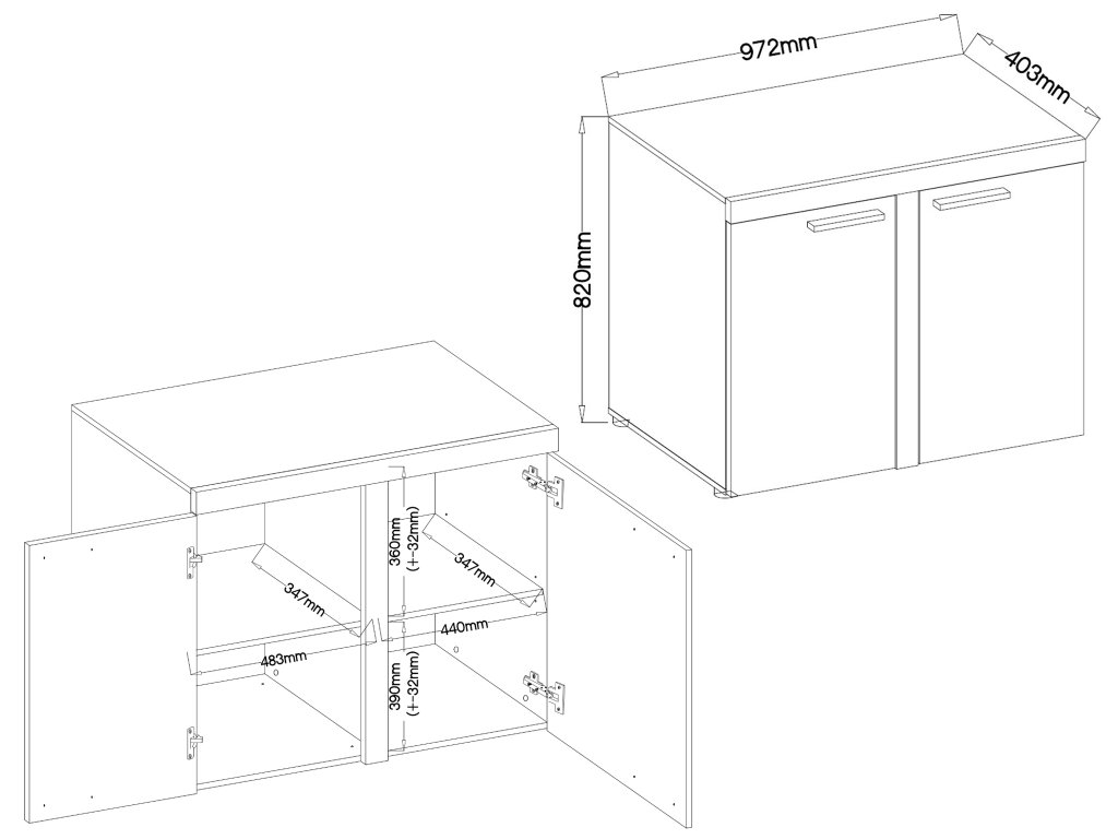 - Anyag: 15 mm laminált forgácslap / HDF tábla / melamin élzárás / fekete műanyag fogantyú