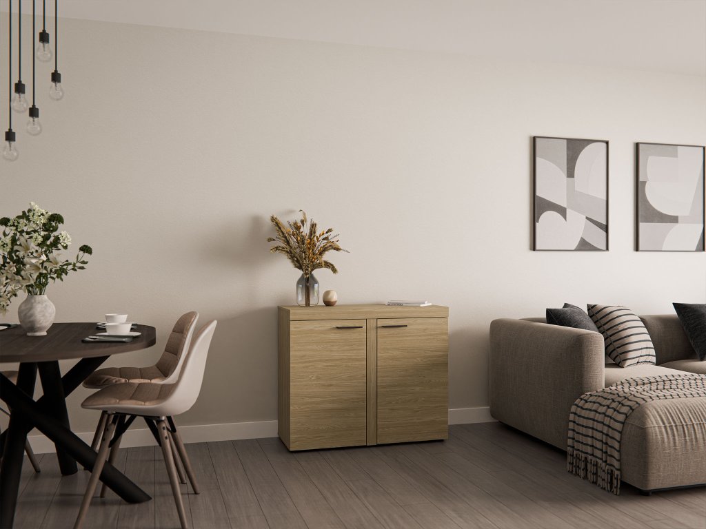 Ez a kétajtós komód úgy lett tervezve, hogy segítsen tökéletes rendet tartani otthonában, stílusbeli kompromisszumok nélkül. Az ajtók mögött két tágas polc található, amelyek könnyedén elnyelik mind a könyveket, mind a lakberendezési kiegészítőket. Az egész belső tér azonos olajozott tölgy dekorban készült, ami kiemeli az egész bútordarab prémium jellegét. Optimális mérete és funkcionális tagolása miatt a Rumba 2F komód kedvenc szervezési segítőtársa lesz, amely a precíz szélélezésének köszönhetően könnyedén megbirkózik a mindennapi terhelésekkel.