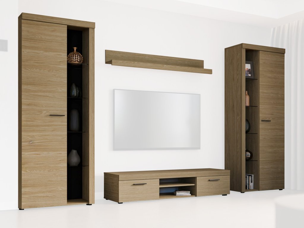 Minőségi Rumba nappali szekrénysor olajozott tölgy kivitelben egyedi nyugalmat és természetes eleganciát áraszt otthonába. Ez a dekoráció hűen imitálja a masszív fa kinézetét jellegzetes szerkezetével, ami mélységet és otthonosságot kölcsönöz a belső térnek. A teljes összeállítás négy kulcskomponensből áll: egy magas és alacsony vitrines szekrényből, egy robusztus TV állványból és egy stílusos fali polcból. Az első osztályú laminált forgácslap használatával és strapabíró szegélyekkel olyan bútort kap, amely nemcsak vizuálisan vonzó, hanem rendkívül erős és könnyen karbantartható, ami ideális központja családja nappalijának.