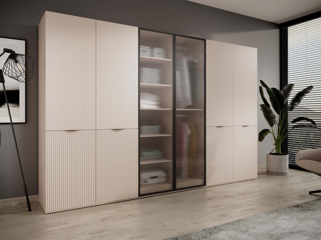 Gyönyörű, elegáns és időtálló stílusú Sandbox Flutes 100 moduláris szekrény, amely feldob minden szobát. Ez az elegáns bézs színű nyílóajtós gardróbszekrény átlátszó üveglapból készült ajtókkal rendelkezik, ami igazán luxusos kinézetet kölcsönöz neki.