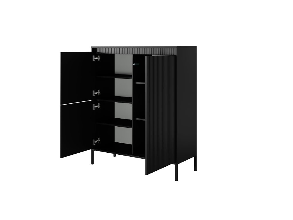 A gyönyörű matt fekete SENSO A3D komód egy modern és divatos bútordarab. Magas fém lábakon áll, melyeknek köszönhetően igazán légies hatást kelt és még könnyen fel is tud mosni alatta. Három kis ajtós szekrénnyel rendelkezik, amelyek push-to-open rendszerrel nyithatók. Az ajtók mögött polcok helyezkednek el. Elhelyezheti bele a könyveit, iratait, esetleg a ruhák tárolására is jó lehet. A komód hátlapja természetes színű HDF lapból készült.