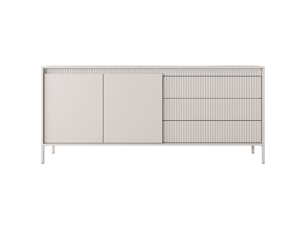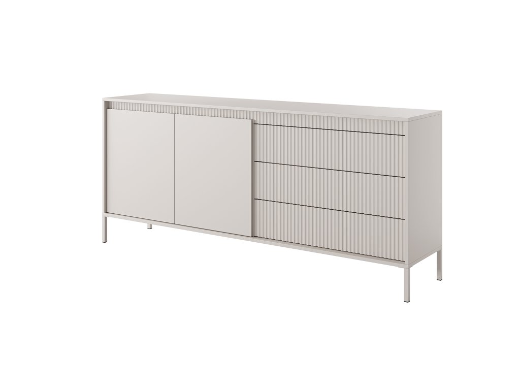A gyönyörű bézs színben készült SENSO C187 széles komód a Senso nappali bútorcsalád része. Rengeteg tároló helyet biztosít a kétajtós szekrénynek és a három széles fióknak köszönhetően. A fiókok lágy 3D-s martott mintával díszítettek, amely igazán modern hatást kelt. A fogantyú nélküli rendszernek köszönhetően nem rendelkezik fogantyúkkal, így egy igazi letisztult stílusú bútordarabot kap. A kétajtós szekrény egy-egy polcot rejt. A komód hátlapja természetes színű HDF lapból készült.