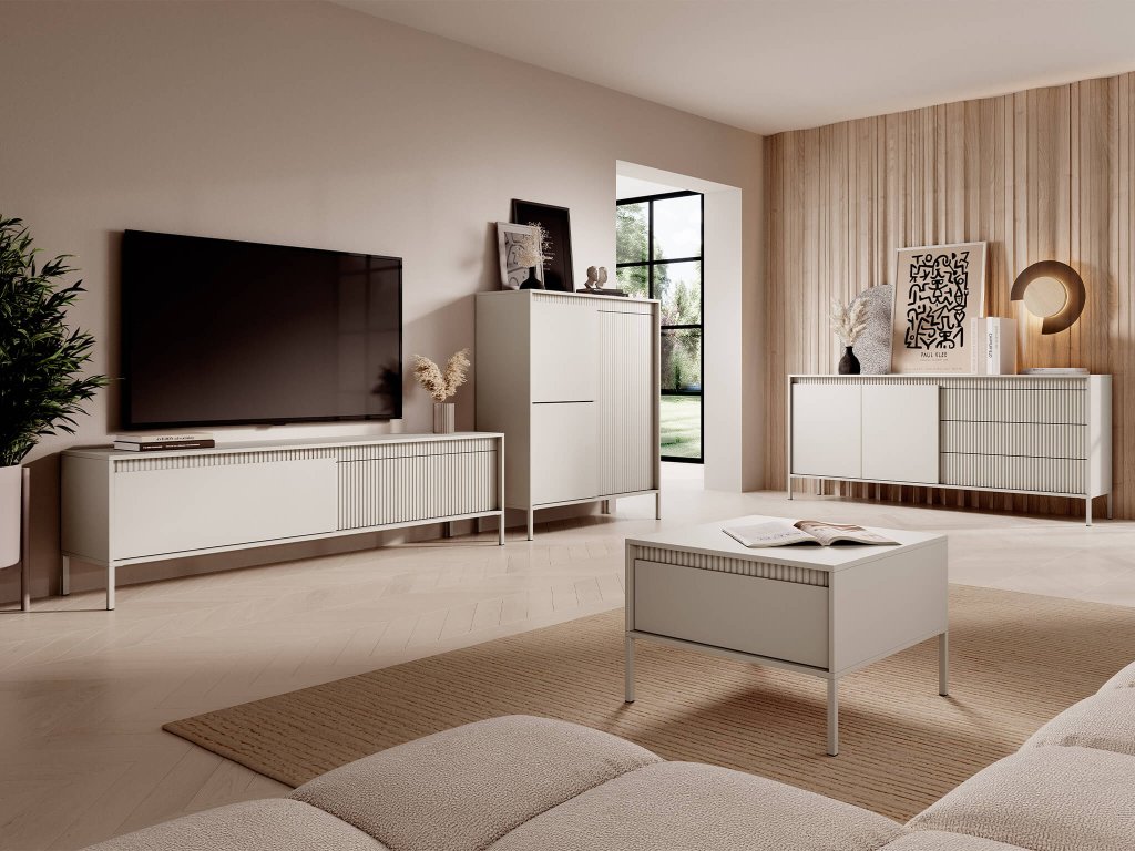 A SENSO nappali bútorcsalád nagyon lágy vonásokkal és modern megjelenéssel rendelkezik. A bútor szett darabjaival berendezheti a nappalit, de a hálószobába, az előszobába vagy a dolgozószobába is megfelelő lehet. Gyönyörű mart mintával díszített 3D-s előlapokkal ellátott. A bútor kollekció magas fém lábakon áll lágy bézs színben. A bézs színárnyalatnak köszönhetően igazán népszerű választást jelent. Az egyes bútor elemek "push to open", azaz fogantyú nélküli rendszerrel rendelkeznek. A Senso bútor összeállítás darabjai laminált MDF bútorlapból készülnek, marott előlappal és ABS élzárással, melynek köszönhetően igazán stabilak és ellenállak.
