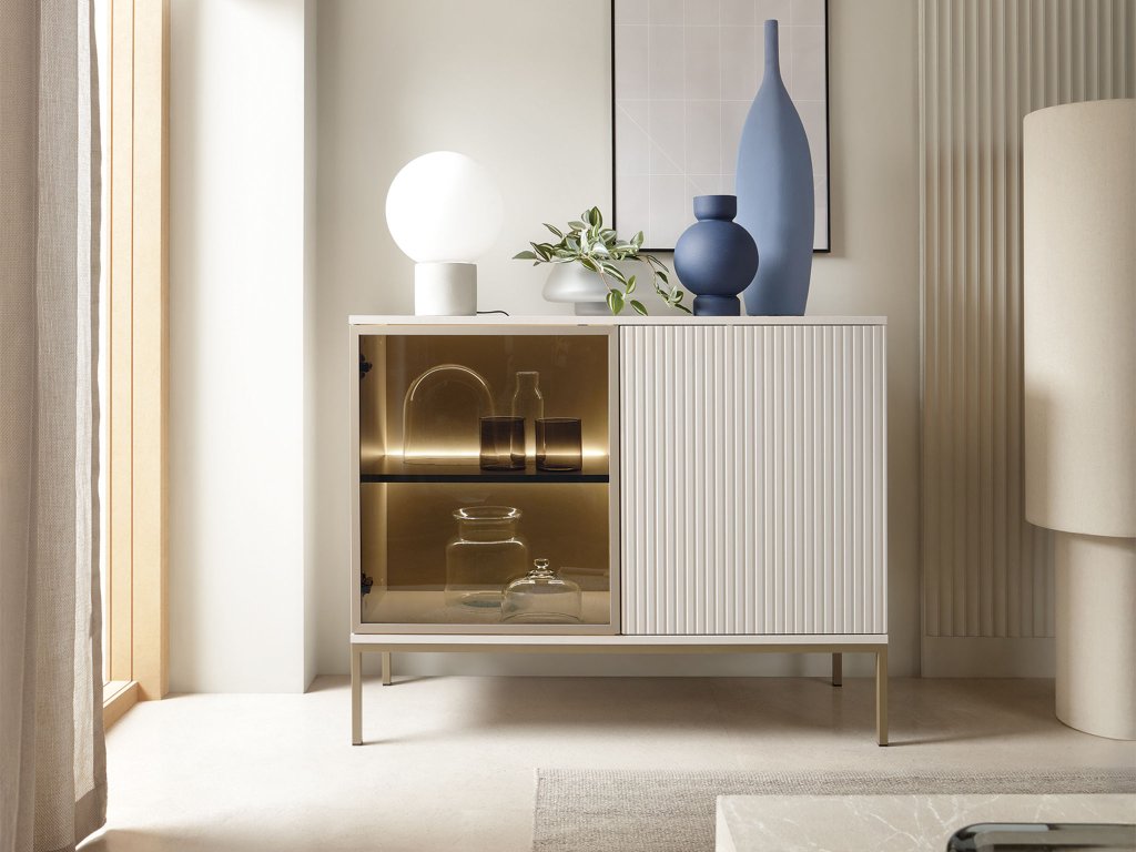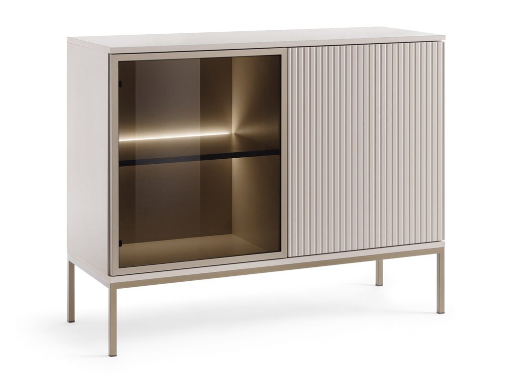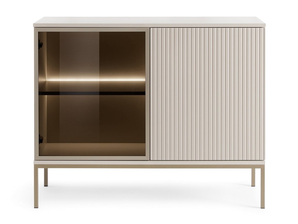 Kétajtós SENTO komód magas kasmír színű lábakkal. A vitrines komód bal ajtaja minőségi edzett üvegből készült, míg a jobb ajtó kasmír színű bordázott előlapokkal rendelkezik, amely igazán ízléses és modern hatást kelt. A komód egyik oldala üveges, míg a másik részébe elteheti azokat a dolgokat, amelyeket nem szeretne szem előtt hagyni. A polc mögött található LED világítás teszi igazán különlegessé a bútordarabot. A tetejére is elhelyezhet dísztárgyakat, családi képeket vagy növényeket. A LED világítás meggyújtása kapcsolóval történik, nincs hozzá külön távirányító.