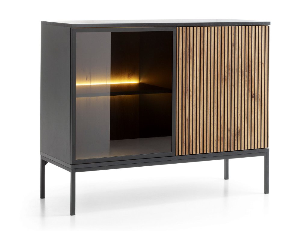 Az elegáns SENTO kétajtós komód magas fekete fém lábakon áll. A bal ajtó minőségi edzett üvegből készült, míg a jobb ajtó wotan tölgy színű és fekete csíkos mintával rendelkezik, amely igazán ízléses és modern hatást kelt. A komód egyik oldala üveges, míg a másik részébe elteheti azokat a dolgokat, amelyeket nem szeretne szem előtt hagyni. A polc mögött található LED világítás teszi igazán különlegessé a bútordarabot. A tetejére is elhelyezhet dísztárgyakat, családi képeket vagy növényeket. A LED világítás meggyújtása kapcsolóval történik, nincs hozzá külön távirányító.
