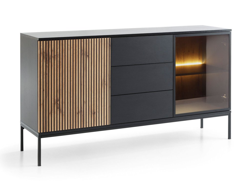 Modern SENTO komód, amely egy vitrin résszel, három fiókkal és egy wotan tölgy színű ajtós szekrénnyel is rendelkezik. A komód a 154 cm szélességének köszönhetően igazán gazdag tároló helyet kínál. A komód közepében három fiók található, amelyek push-to-open (fogantyú nélküli rendszerrel) nyithatók. A bal szélében dekoratív hosszanti fekete csíkokkal díszített wotan tölgy színű ajtó mögött egy tágas polc található. A jobb oldalában egy vitrin látható üveges ajtóval. Ebben a részben a polc mögé elegáns LED világítást szereltek be. A LED világítás meggyújtása kapcsolóval történik, nincs hozzá külön távirányító. A komód tetejére pedig elhelyezheti a dísztárgyait, családi fényképeit vagy növényeit.