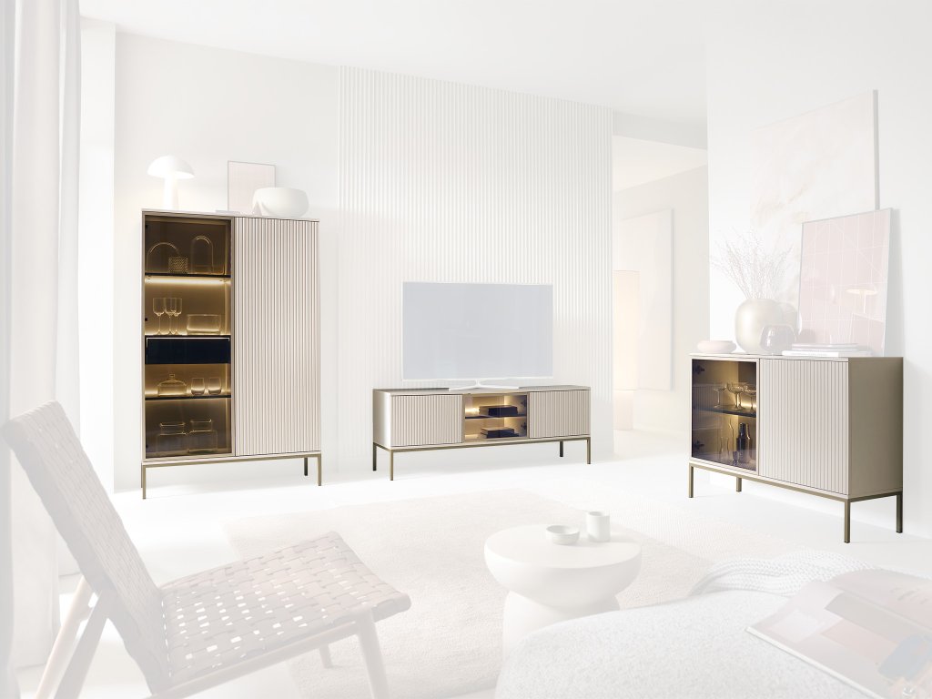 A SENTO nappali garnitúra a modern formákat finom, természetes részletekkel ötvözi. Jellegzetes elemei az üvegajtók és a dekoratív bordázott felületek, amelyek különleges karaktert és időtálló stílust kölcsönöznek a bútoroknak. Ennek köszönhetően a kollekció mindkét színváltozatban elegánsan megjelenéssel rendelkezik. A kollekció két színváltozatban is elérhető: kasmír és fekete. A sötét füstös edzett üvegek a világos kasmír színnel kombinálva igazán kontrasztos és modern kinézettel rendelkeznek, míg a fekete a wotan tölggyel kombinálva elegáns kinézetet garantál. A bútor szett több eleméhez LED világítás is tartozik, amely szépen kiemeli a vitrinek belső polcait, és kellemes hangulatot teremt a helyiségben. A SENTO komódok, vitrinek és asztalok nagy előnyét a magas fekete fém lábaik adják, amelyeknek köszönhetően könnyen felporszívózhat alattuk Ön vagy a robotporszívó is. A bútorcsaládba tartozó tágas komódokat elhelyezheti a nappaliba vagy a hálószobába is. A bútor kollekció laminált bútorlapból készül, ABS élzárással és fém lábakkal. A SENTO bútorcsalád két vonzó színváltozatban érhető el, így könnyen kiválaszthatja azt, amelyik a legjobban illik az otthonába.