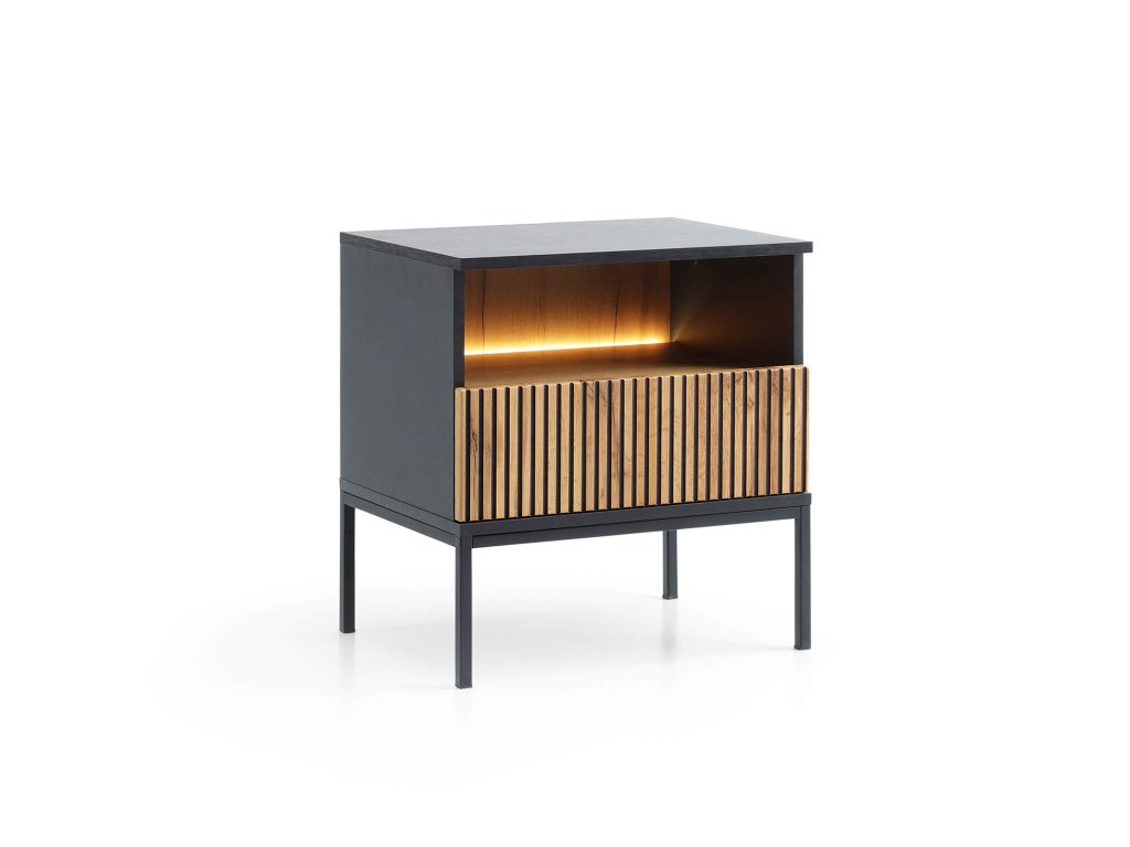 Igazán divatos és modern kiegészítő lehet a hálószobába ez a gyönyörű fekete színű SENTO éjjeliszekrény, amely nem mindennapi kinézettel rendelkezik. Az éjjeliszekrény egy wotan tölgy színű fiókkal rendelkezik, amely gyönyörű fekete marott mintával rendelkezik. A fiók fölött egy praktikus nyitott polc látható, amelyet az elegáns LED világítás tesz igazán különlegessé. A LED világítás meggyújtása kapcsolóval történik, nincs hozzá külön távirányító. Ez a modern éjjeliszekrény tökéletes választás minden modern hálószobába mondjuk egy szép kárpitozott ágy mellé.