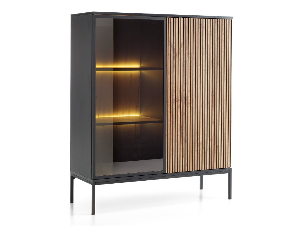 A kétajtós SENTO vitrines komód polcai elegáns LED világítással rendelkeznek a vitrin bal oldalában a polcok mögött. Az egyik ajtó edzett üvegből készül, míg a másik wotan tölgy színű és fekete csíkos mintával rendelkezik, amely igazán ízléses és modern hatást kelt. A komód egyik oldala üveges, míg a másik részébe elteheti azokat a dolgokat, amelyeket nem szeretne szem előtt hagyni. A LED világítás meggyújtása kapcsolóval történik, nincs hozzá külön távirányító. A 104 cm széles és 126 cm magas vitrines komód praktikus méretekkel rendelkezik, de amennyiben egy nagyobb vitrines szekrényt keresne, ilyet is talál a kínálatunkban.