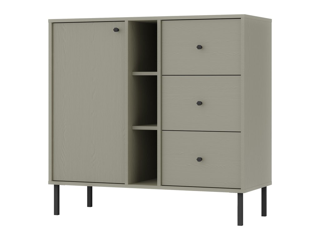 A zöld színű SERENA II 824 háromfiókos komód egy elegáns és stílusos bútordarab az otthonába. Minőségi laminált DTD-ből készült ABS élzárással. A modern kialakításának köszönhetően igazán szofisztikált kinézettel rendelkezik. A három tágas fiók számos tároló helyet biztosít. Ezhhez társul még az egyajtós szekrény és a nyitott polcok. A komód szép fekete színű fogantyúkkal és fekete színű lábakkal rendelkezik.