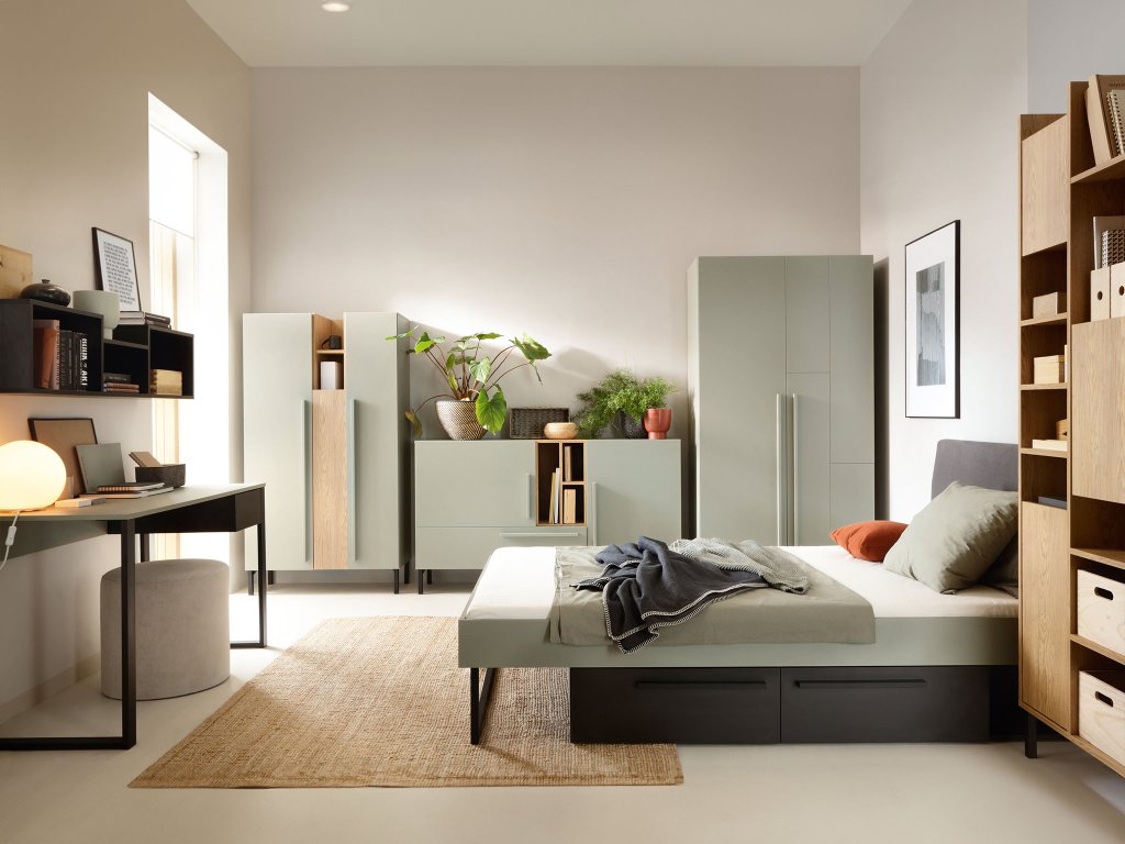 A SERGIO ifjúsági szoba szett 6 bútordarabot tartalmaz a zöld Sergio gyerekszoba kollekcióból: