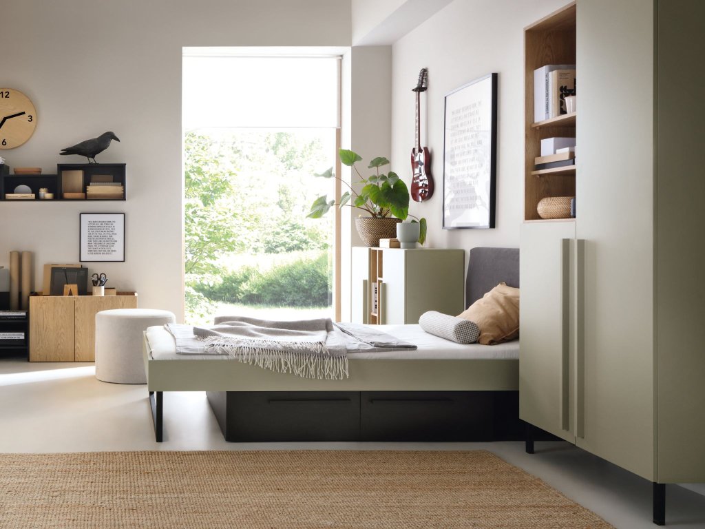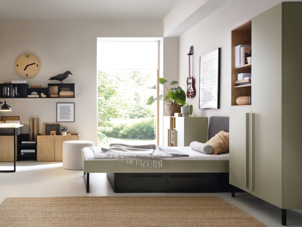 Praktikus és stílusos SERGIO gyerekszoba bútor garnitúra, amely kamaszok szobájába, de kisebb gyerekek gyerekszobájába is megfelelő lehet. Ez az időtálló kollekció lányoknak és fiúknak is egyaránt megfelelő. Két gyönyörű színváltozatban érhető el: bézs és zöld színekben. Minden komód, ruhásszekrény és polcos szekrény magas fekete lábakkal és hosszú keskeny fogantyúkkal rendelkezik. Az egyes bútorok minőségi 16 mm vastag laminált bútorlapból készülnek ABS furnérral biztosítva. A zöld színben készült bútorok balti tölggyel és antracit színekkel vannak kombinálva, míg a homokszínű elemek olajozott tölggyel és sötétkékkel az egyes fiókokon.
