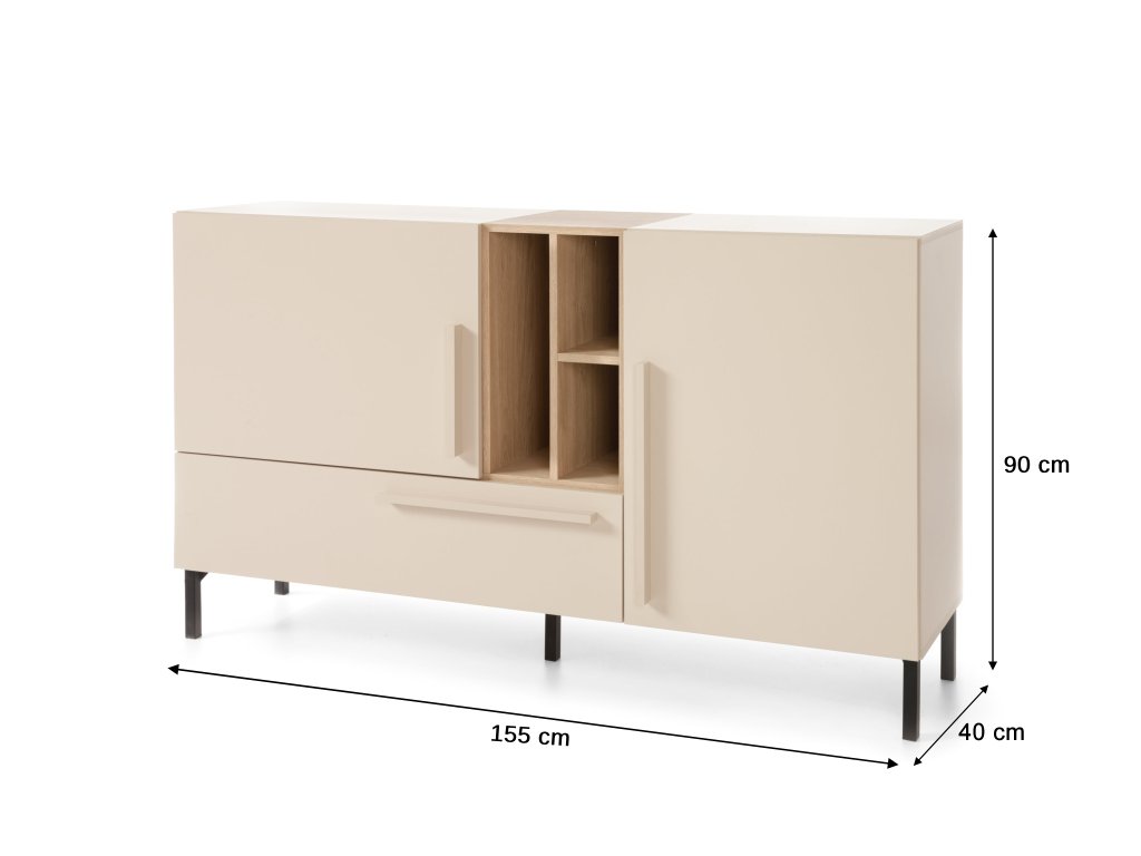 SERGIO S6 bézs széles komód, amely igazán mutatós darab lehet minden otthonban. Nyitott polcokkal, tágas fiókkal és két kis ajtós szekrénnyel rendelkező minőségi komód, amely nem csak a gyerekszobában, de a nappaliban vagy a hálószobában is remekül mutat majd.